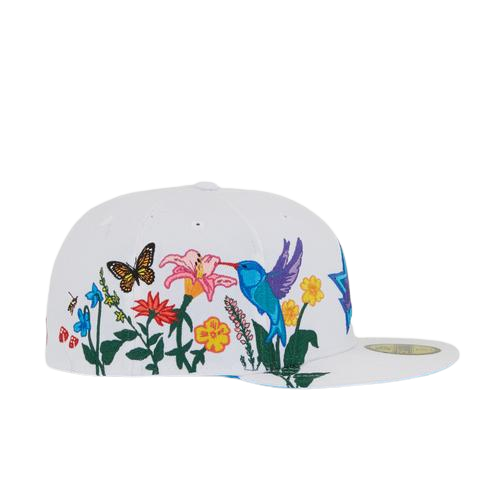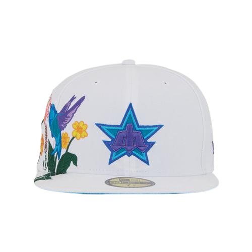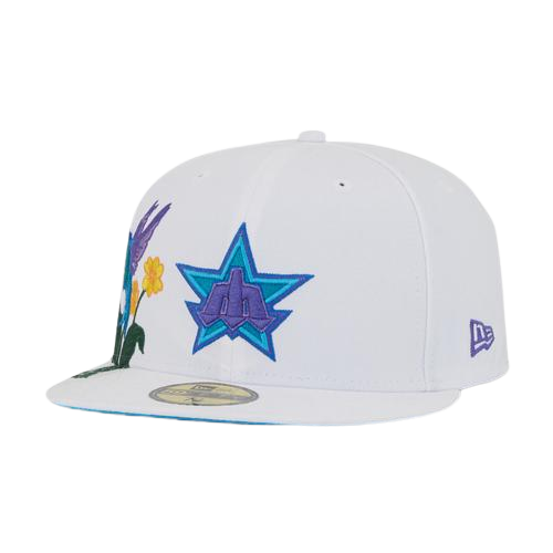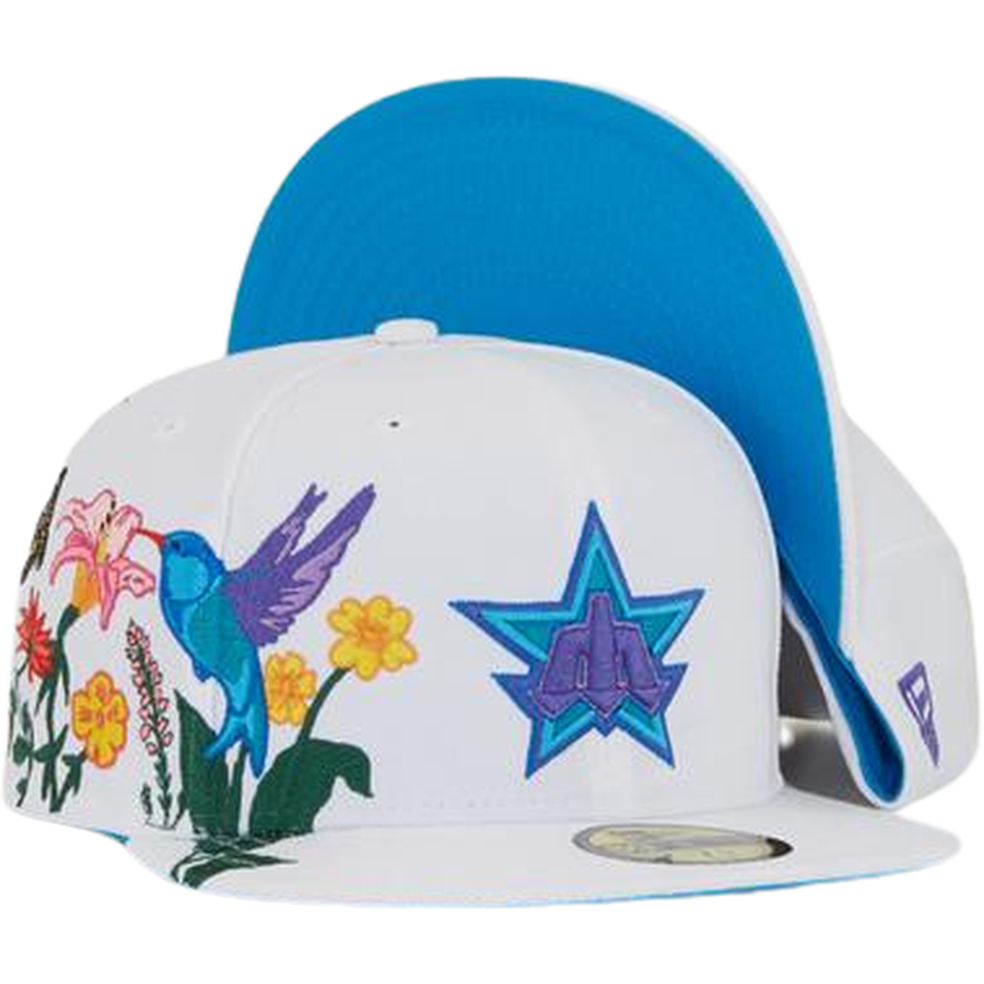 This New Era Seattle Mariners "White Blooming" Blue Undervisor 59FIFTY Fitted Hat has a white six panel structured high crown and embroidered eyelets with a white fabric squatchee button. The fitted cap has a white flat bill with a blue undervisor. The front panel features the Seattle Mariners logo embroidery. The left panel of the fitted displays the New Era logo and the official MLB logo embroidery on the rear crown.
