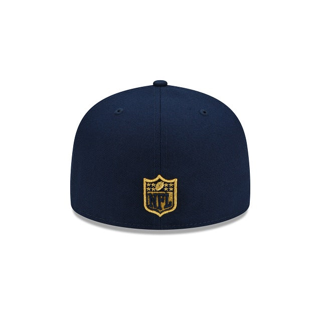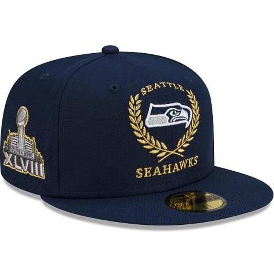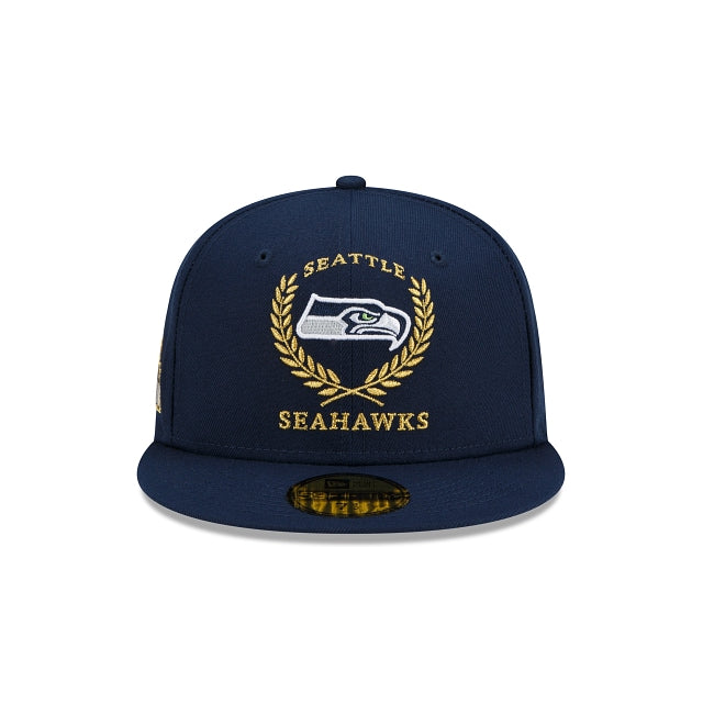 The Seattle Seahawks Gold Classic 59FIFTY Fitted Cap features an embroidered Seahawks insignia at the front panels with a league specific patch at the right-wear side and the NFL Shield at the rear.