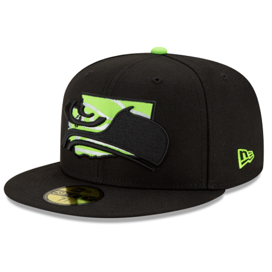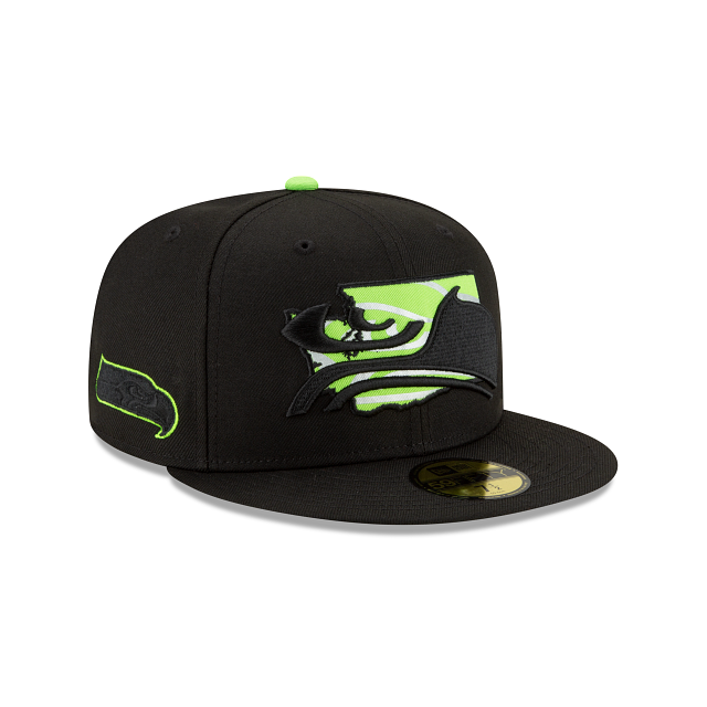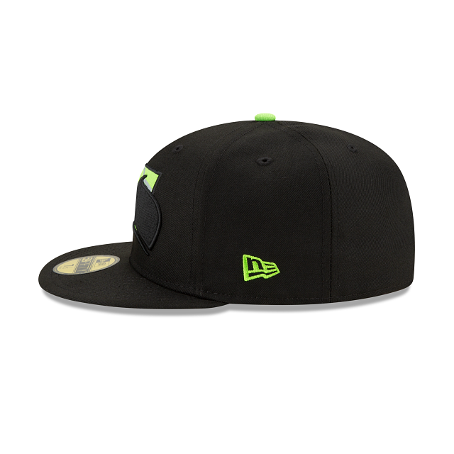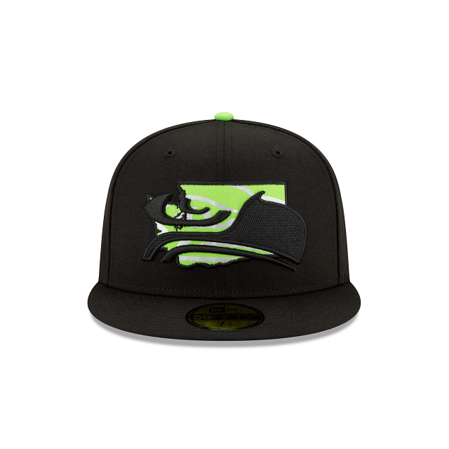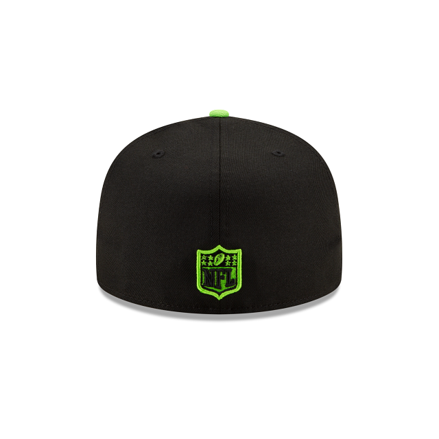 The State Logo Reflect Seattle Seahawks is a black on black with lime green colorway. The entire fitted is midnight black including the 6 panels , eyelets and brim. The squatchee button located at the top and New Era logo on the left of the fitted is lime green. The right side patch is black with lime green colorway as well.The team logo is displayed on the front embroidered in black/lime green behind shape of the team's state with the lime green bottom undervisor. The official NFL shield is also embroidered in lime green and black threads.