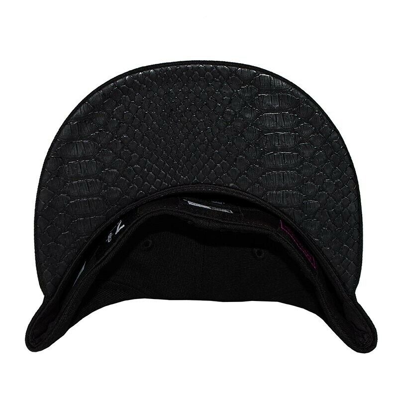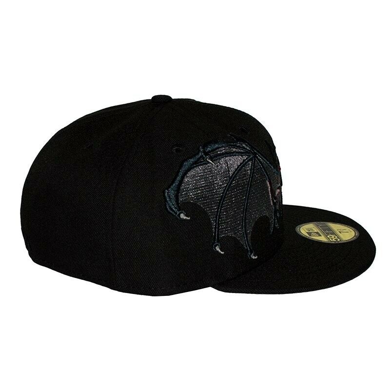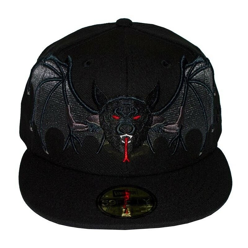 This New Era black bat fitted hat has a solid black six panel high crown, embroidered eyelets and fabric squatchee button. The flat bill of the fitted is also black with a black snakeskin undervisor. The front panel features a large black back with red eyes & tongue with its wings expanded to cover most of the front crown.