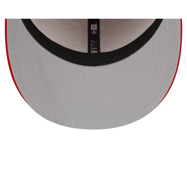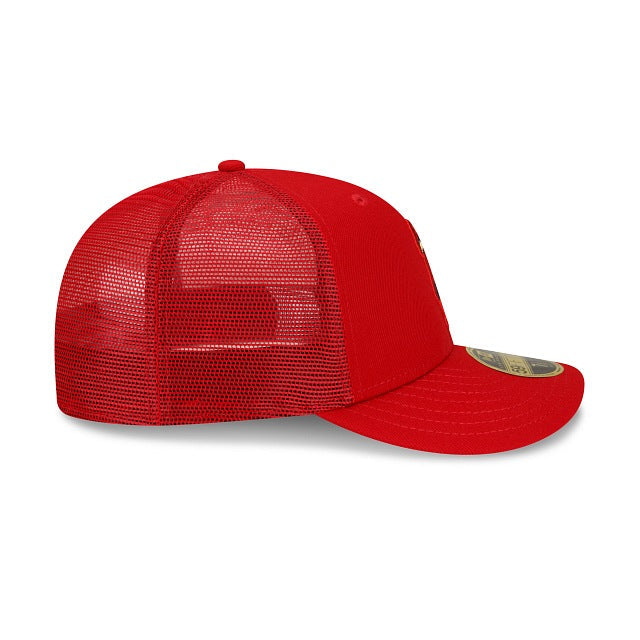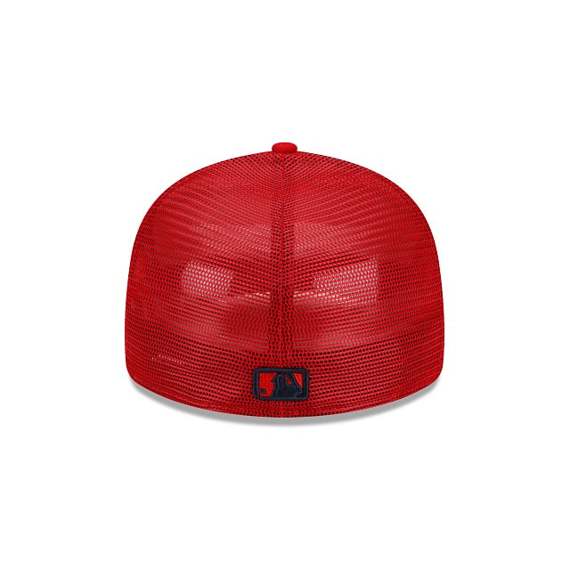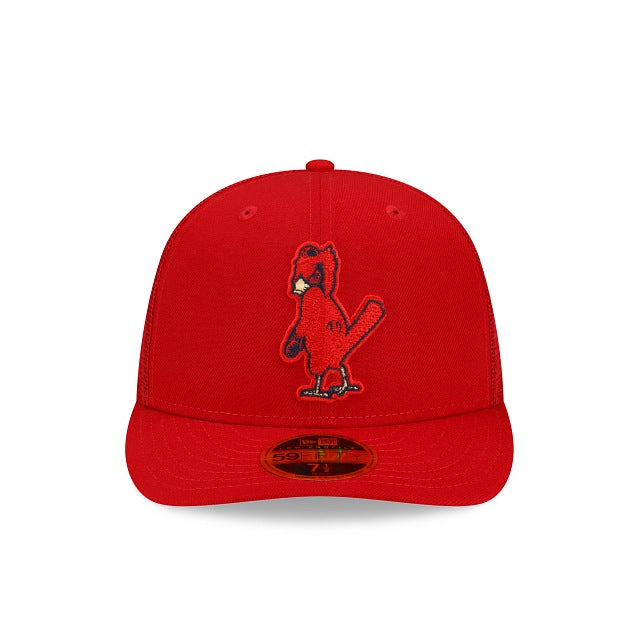 The St. Louis Cardinals 2023 Batting Practice Low Profile 59FIFTY Fitted Cap features an embroidered Cardinals logo at the front panels with a matching MLB Batterman logo at the rear and a gray undervisor.