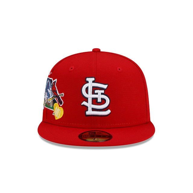 City ties. Represent your team with the St. Louis Cardinals City Cluster 59FIFTY Fitted Cap featuring an embroidered Cardinals logo at the front panels with a city inspired patch at the right-wear side and a matching MLB Batterman logo at the rear. Additional details include a gray undervisor.