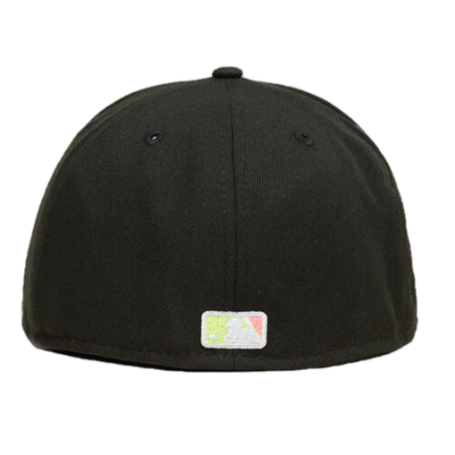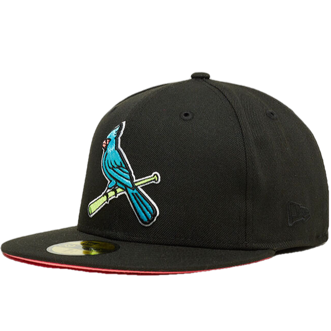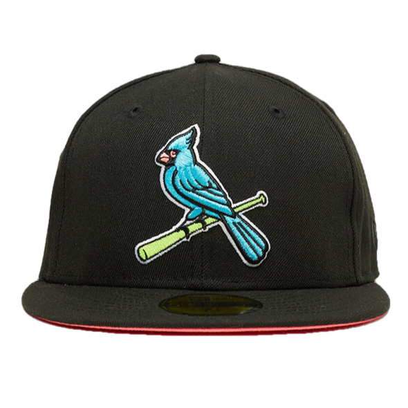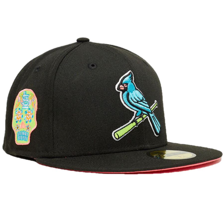 This New Era St. Louis Cardinals Dia De Los Muertos 59FIFTY fitted hat was released by Snipes USA. The fitted has a black six panel structured high crown, embroidered eyelets, fabric squatchee button and flat bill. The fitted has a fluorescent pink bottom undervisor and black sweatband. The front panel features the St. Louis Cardinals logo embroidered in vice blue thread with the a Mexican calavera (skull) embroidered on the right panel.