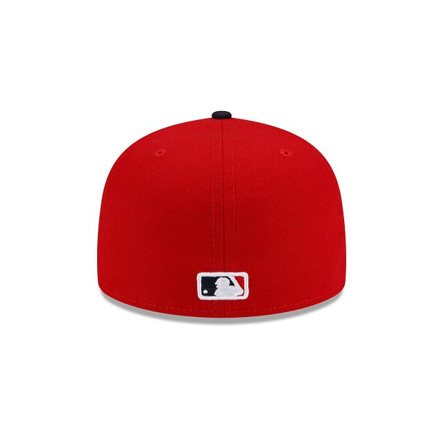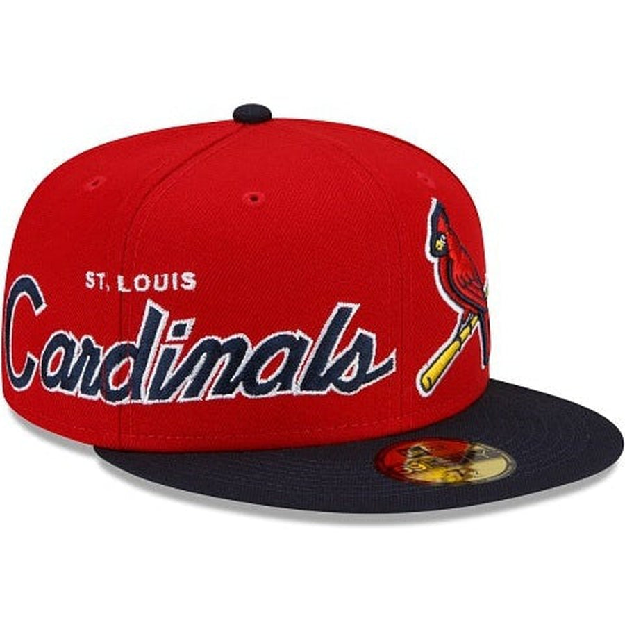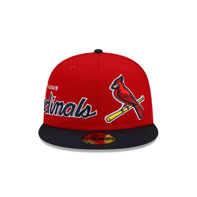 The St. Louis Cardinals Double Logo 59FIFTY Fitted Cap features a two tone team fabrication with an embroidered Cardinals logo at the front left-wear panel, complimented by a team script at the right-wear side and a matching MLB Batterman logo at the rear.