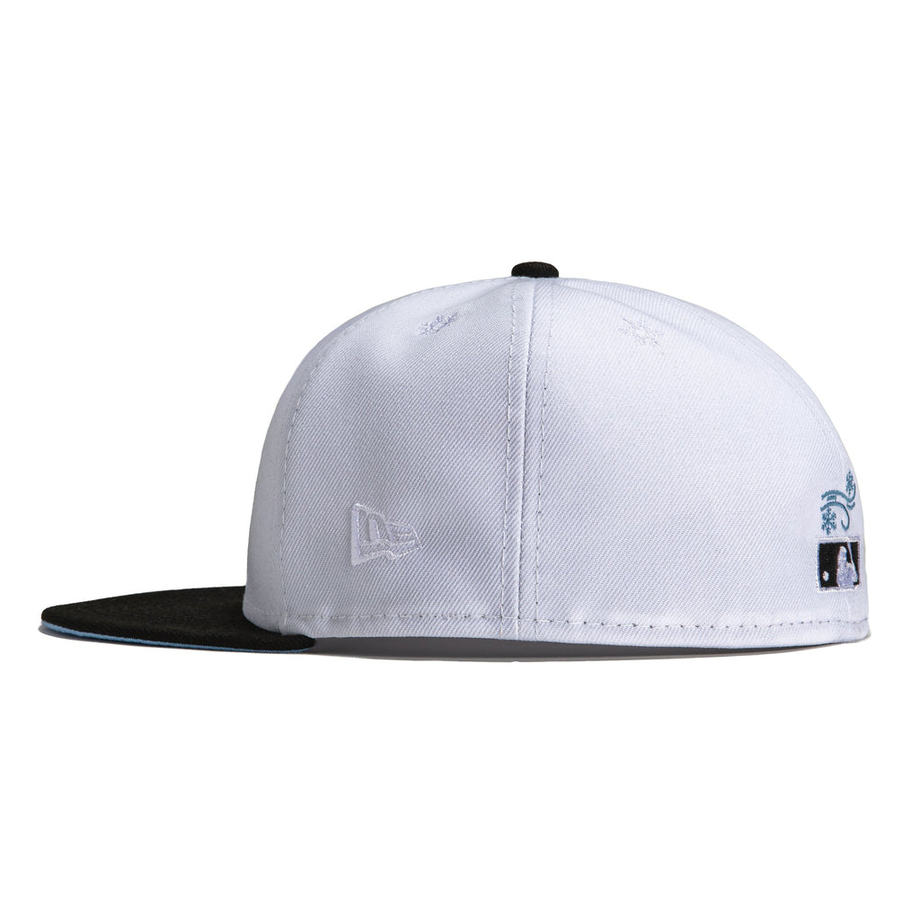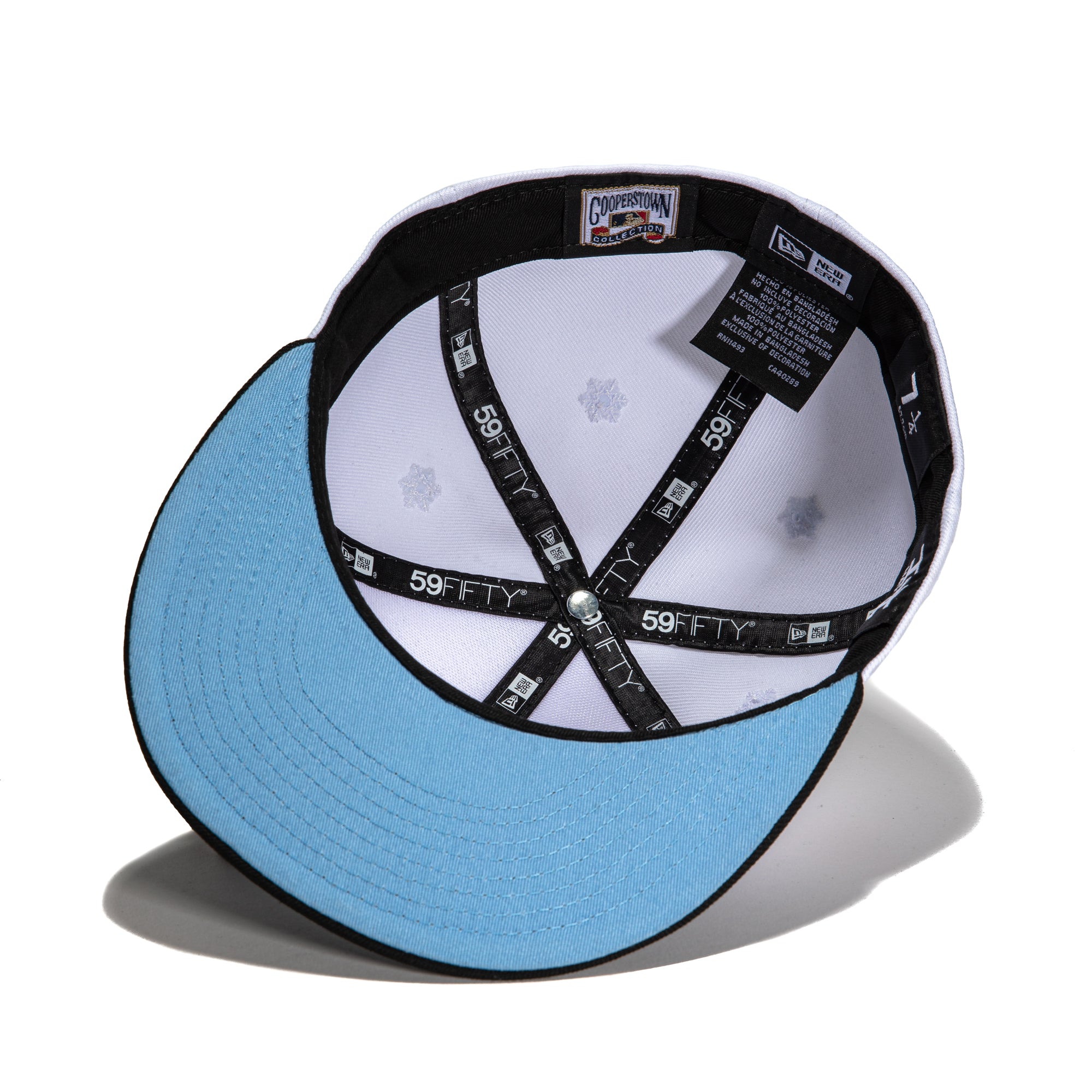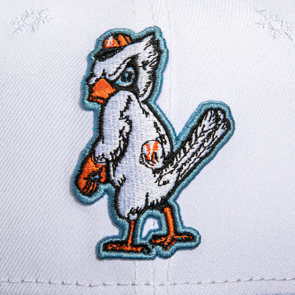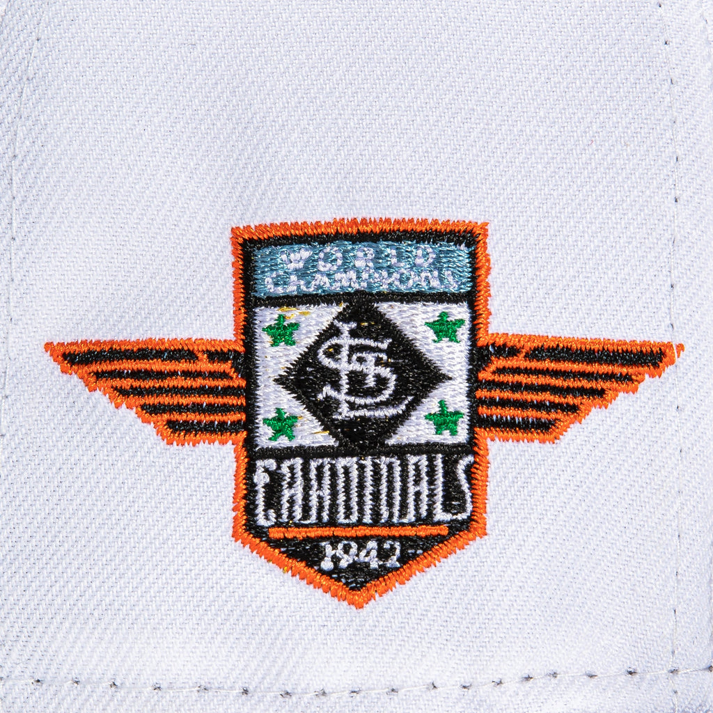 This New Era St Louis Cardinals 'Snowman' 1942 World Series Champions 2022 59FIFTY Fitted Hat was released by Hat Club. The fitted has a white six panel structured high crown and snowflake embroidered eyelets with a black fabric squatchee button. The flat bill of the fitted cap is also black with a light blue undervisor. The front panel features the St. Louis Cardinals logo embroidery and a side patch embroidered on the right panel. The left panel of the fitted displays the New Era logo and the official MLB Batterman insignia embroidered on the rear crown. The fitted hat colorway is inspired by the colors of a snowman.