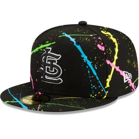 Light up the night with the St. Louis Cardinals Streakpop 59FIFTY Fitted Cap featuring an embroidered team logo at the front panels with a neon splatter detailing throughout the crown and a MLB Batterman logo at the rear. Additional details include a gray undervisor.