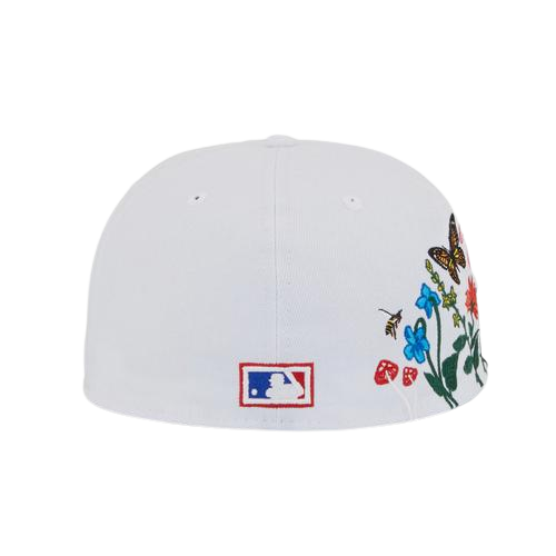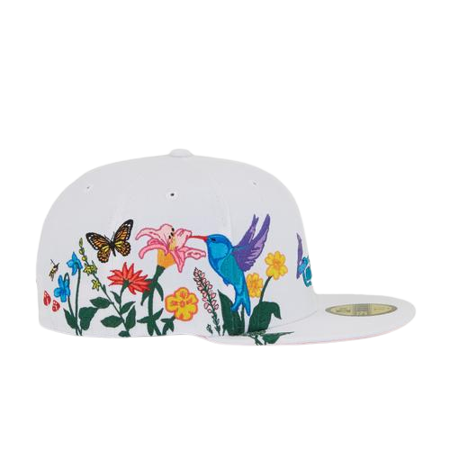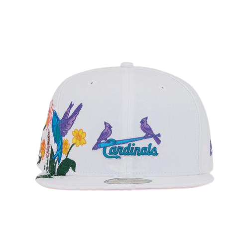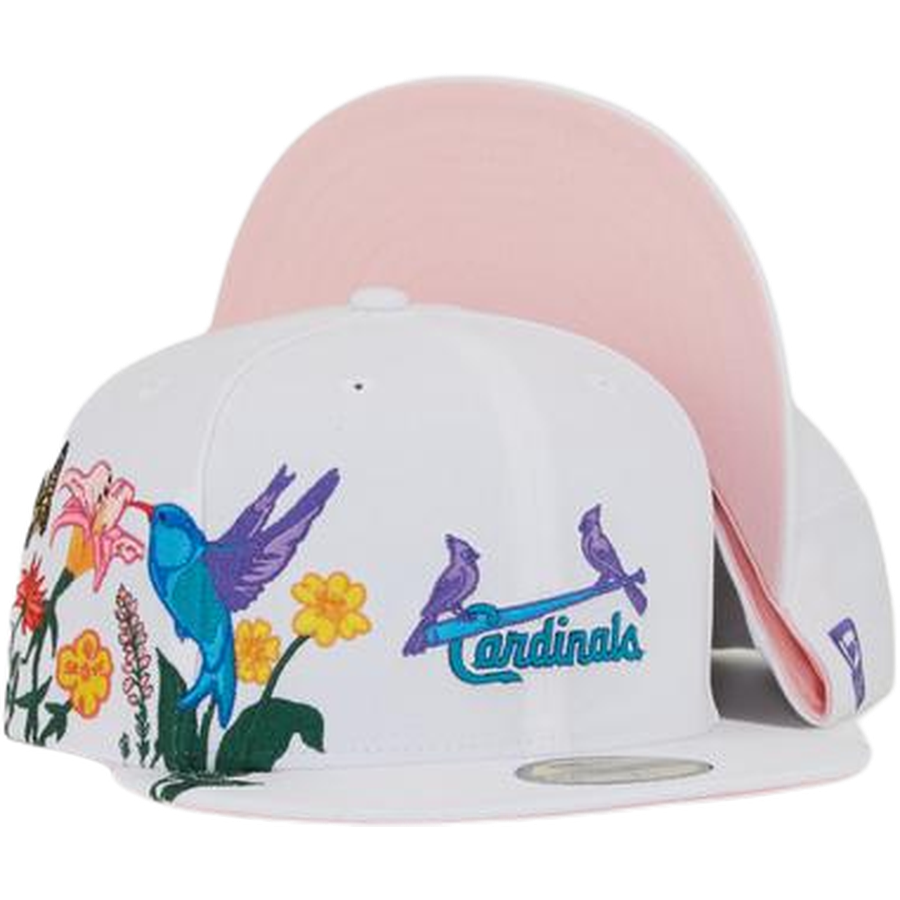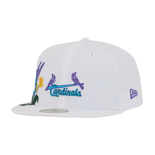 This New Era St. Louis Cardinals "White Blooming" Pink Undervisor 59FIFTY Fitted Hat has a white six panel structured high crown and embroidered eyelets with a white fabric squatchee button. The fitted cap has a white flat bill with a pink undervisor. The front panel features the St. Louis Cardinals logo embroidery. The left panel of the fitted displays the New Era logo and the official MLB logo embroidery on the rear crown.