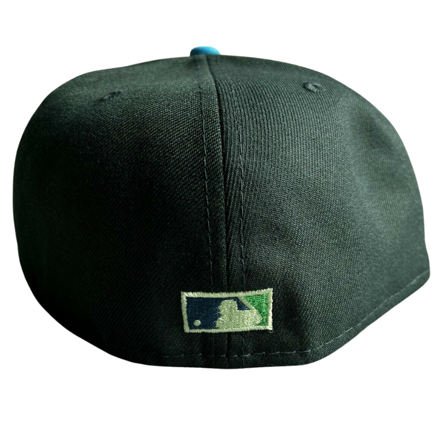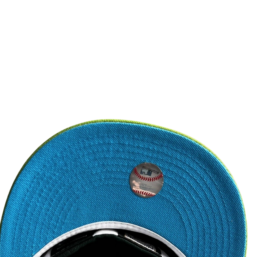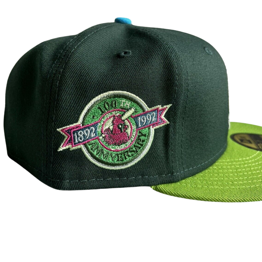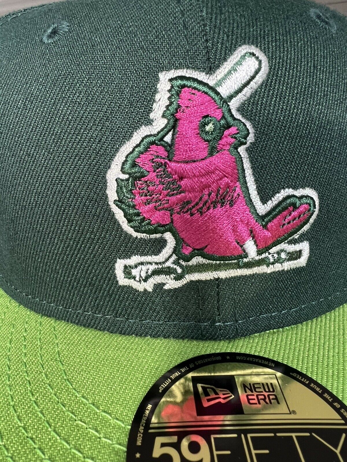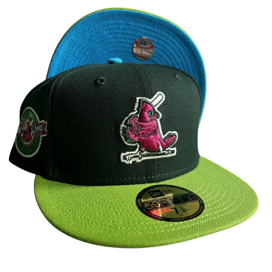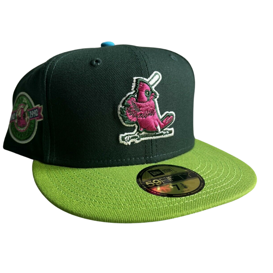 Wings of Fire Moon Rising' inspired fitted hat is a My Fitteds exclusive release. The 59FIFTY fitted cap features a dark green six panel structured high crown and embroidered eyelets with a turquoise fabric squatchee button. The flat bill of the fitted is light green with a turquoise undervisor and white sweatband. The front panel features the St. Louis Cardinals logo embroidery with a 100th Anniversary side patch embroidery on the right panel. The fitted hat colorway was inspired by the NY Times Bestselling series Wings of Fire, Moon Rising book written by