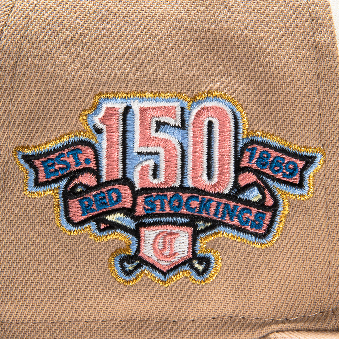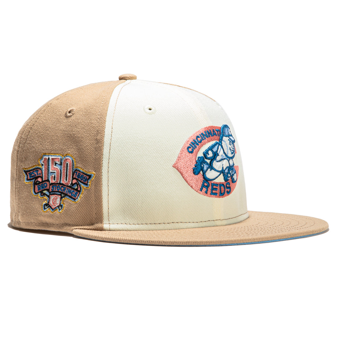 This New Era Sugar Shack 2.0 Cincinnati Reds 150th Anniversary 59FIFTY Fitted Hat is a Hat Club Exclusive. It has a tan and white six panel structured high crown and embroidered eyelets with a tan and white fabric squatchee button. The fitted cap has a tan flat bill with a sky blue undervisor and white sweatband. The front panel features the Cincinnati Reds logo embroidery and a 150th Anniversary side patch embroidery on the right panel. The left panel of the fitted displays the New Era logo and the official MLB logo embroidery on the rear crown.