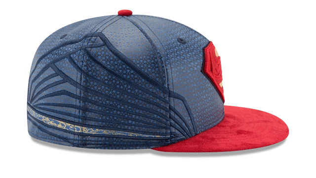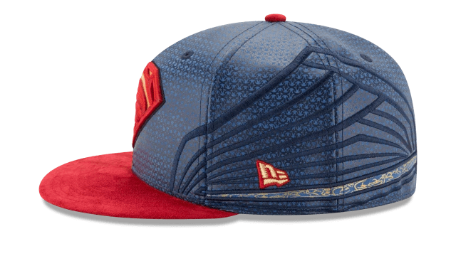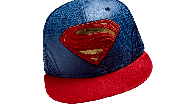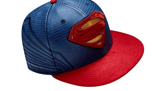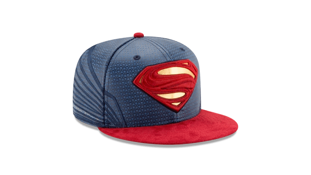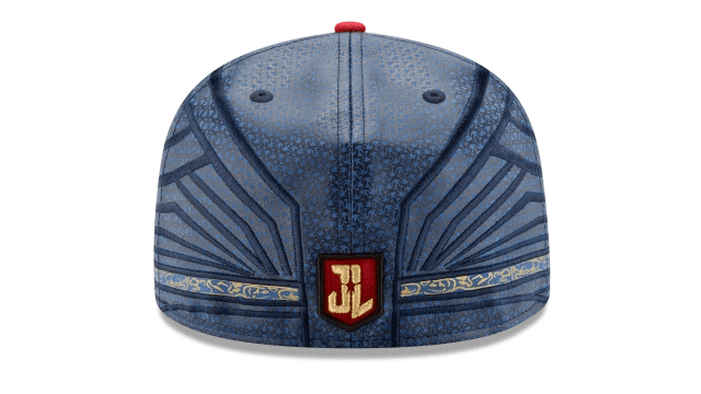 How does this Superman hat accurately convey Superman's super-suit? A blue body with printed costume pattern overlaid with a raised, embroidered Superman symbol. Ribbed, embroidered lining reflecting the sides of Superman's costume -- this includes strips filled with carefully applied Kryptonian characters. The bill? Flat, red, and felt-like -- a clever representation of Superman's deep-red cape. Under the bill? An image of Superman's movie symbol. Hey! What's on the back?? More ribbed costume accents and an embroidered Justice League movie shield. The official New Era sticker? It's right there, resting soundly on top of the cape...er, bill. The lining? A soft interior featuring floating Superman symbols, Justice League movie symbols and logos.
