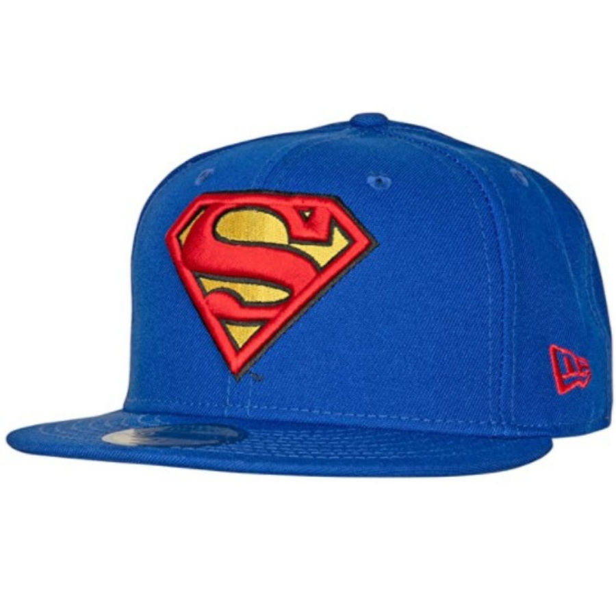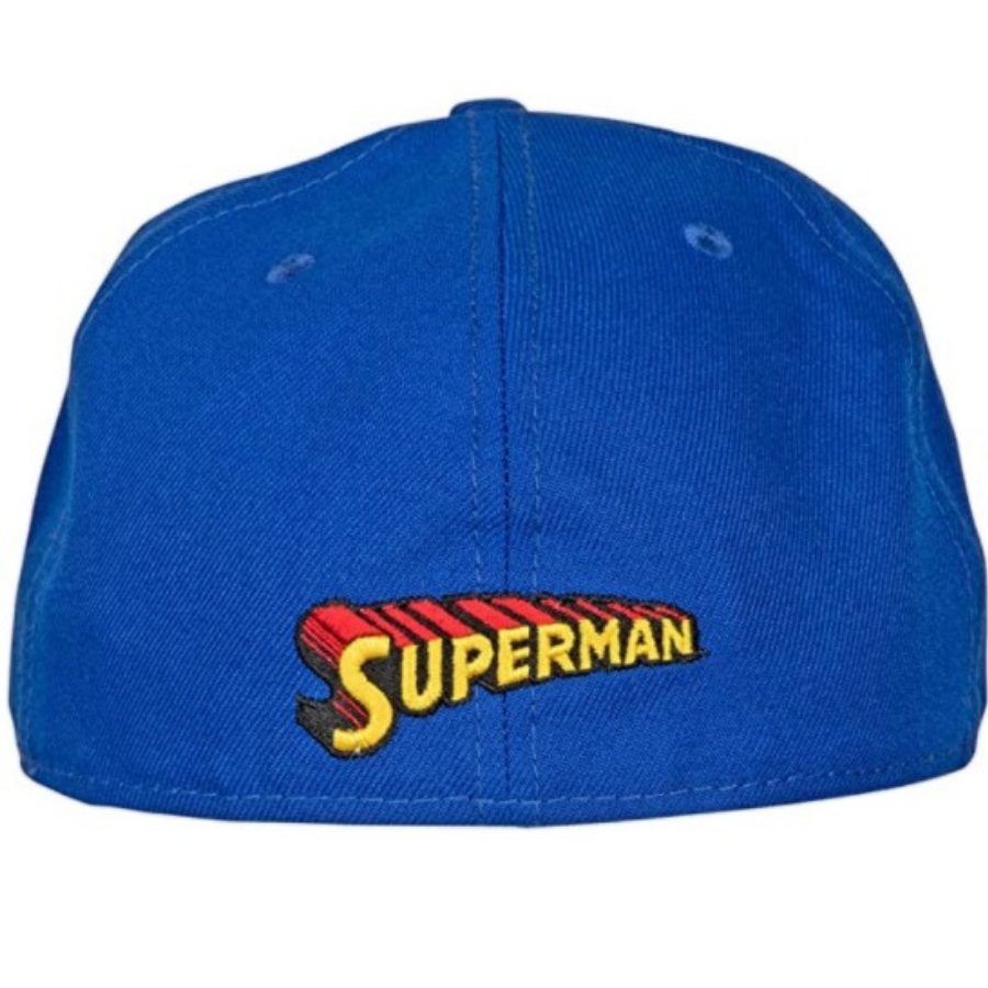 Superman fitted hat has a royal blue six panel structured high crown, embroidered eyelets and fabric squatchee button. The flat bill of the fitted is also royal blue with a royal blue undervisor and black sweatband. The front panel features the iconic Superman logo embroidery enlarged in red and yellow threads. The back of the high crown features the script "Superman" in stylized letters.