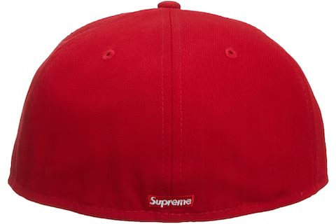 This New Era designer Supreme devil horn logo fitted hat has a red six panel structured high crown, embroidered eyelets, fabric squatchee button and flat bill. The front panel features the Supreme "S" logo with little devil horns protruding from the top embroidered in white thread. The rear crown of the fitted features the the traditional Supreme box logo.