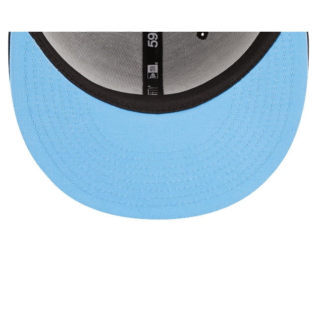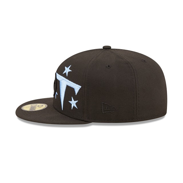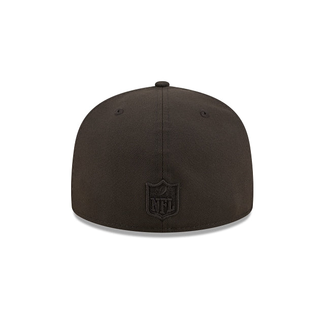 The Tennessee Titans Logo Feature 59FIFTY Fitted Cap has an embroidered blackout Titans logo overlayed with a team colored feature logo at the front panels, and a blackout NFL Shield at the rear. Additional details include a blue undervisor.