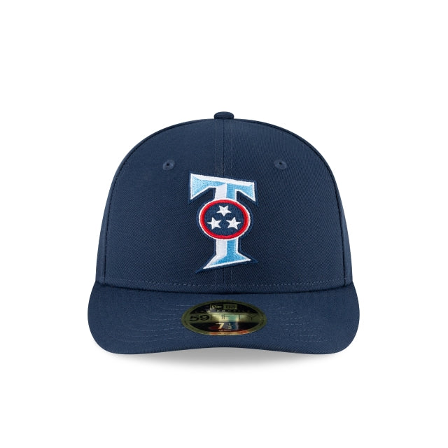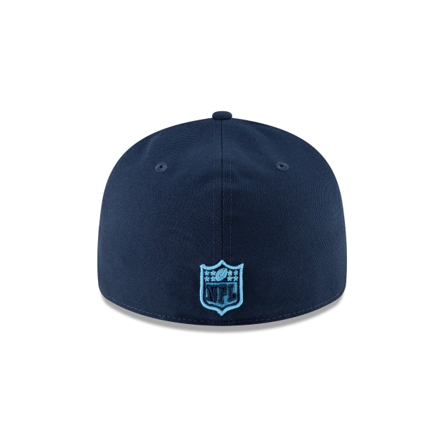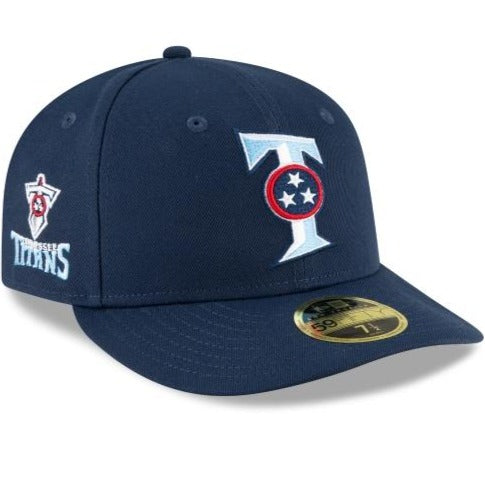 The Tennessee Titans Logo Mix Low Profile 59FIFTY Fitted Cap features a blend of Titans logos embroidered at the front panels with a team wordmark at the right-wear side and a team color NFL Shield at the rear. The undervisor of this cap matches the cap color.