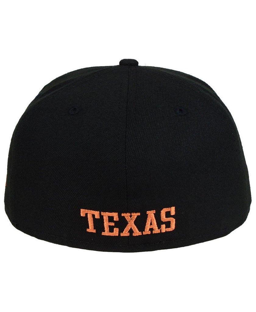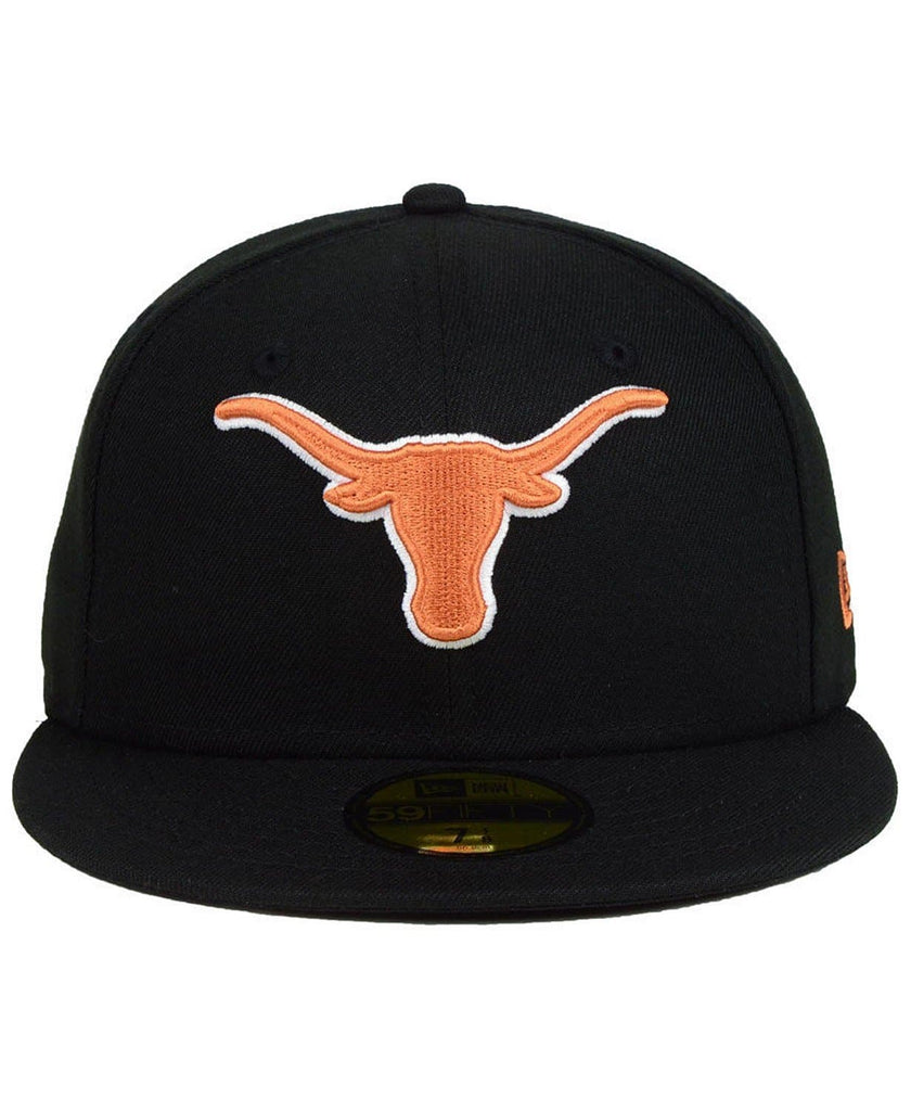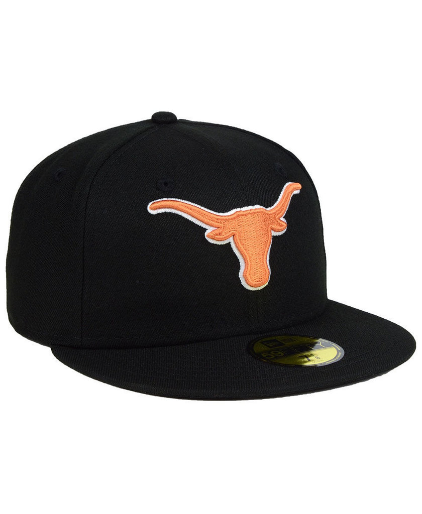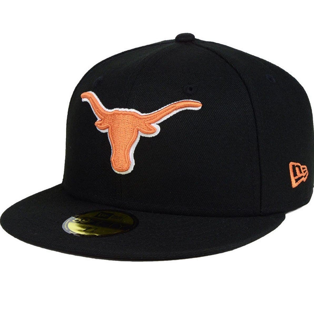 The New Era Texas Longhorns 59Fifty fitted hat has a black and peach colorway. The structured 6 panel high crown, the embroidered eyelets and fabric squatchee button are black in color. The flat brim of the fitted is also black. The front logo depicts the Texas Longhorns team logo embroidered in peach thread. The back of the fitted displays the wordmark "Texas" in peach thread and the New Era logo on the left panel is embroidered in peach thread as well. Great fitted hat for students of the University of Texas and supporters of the NCAA football team Texas Longhorns .