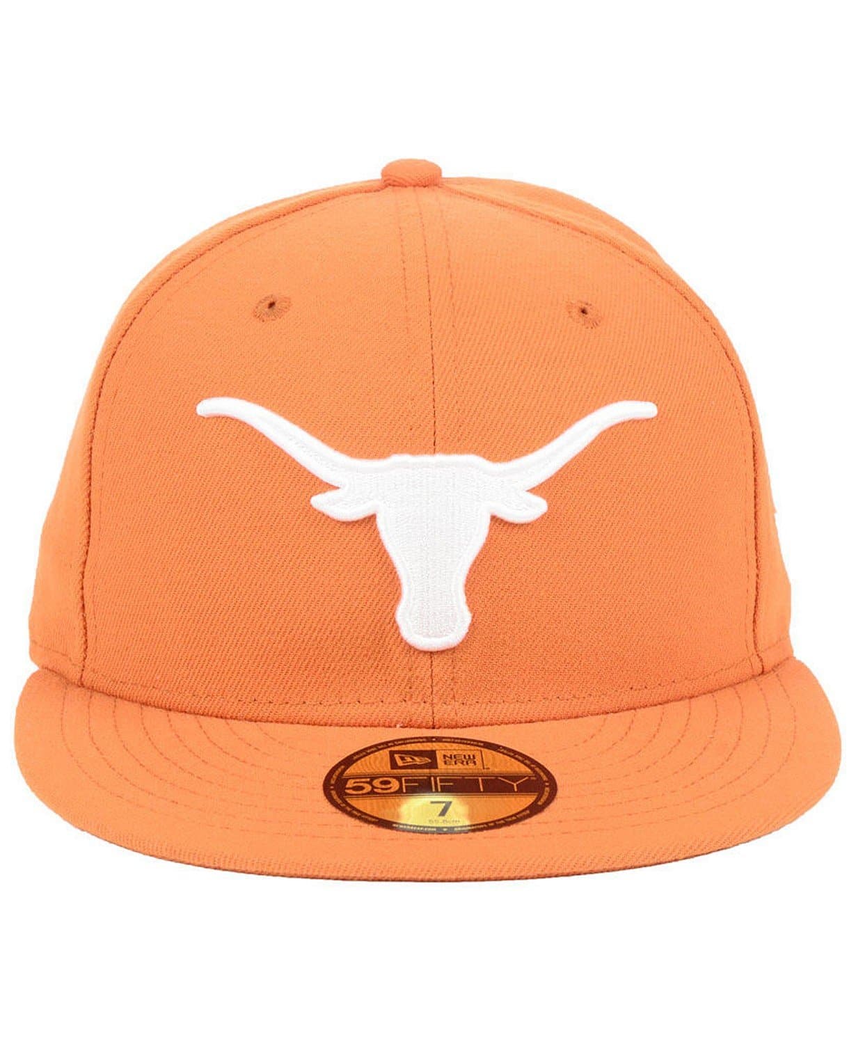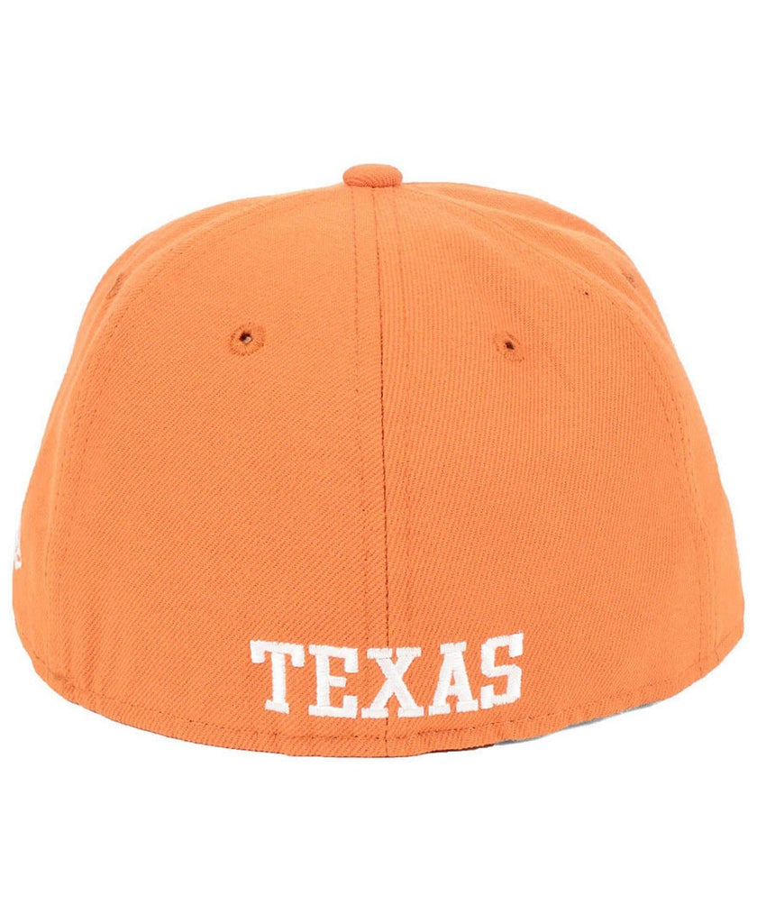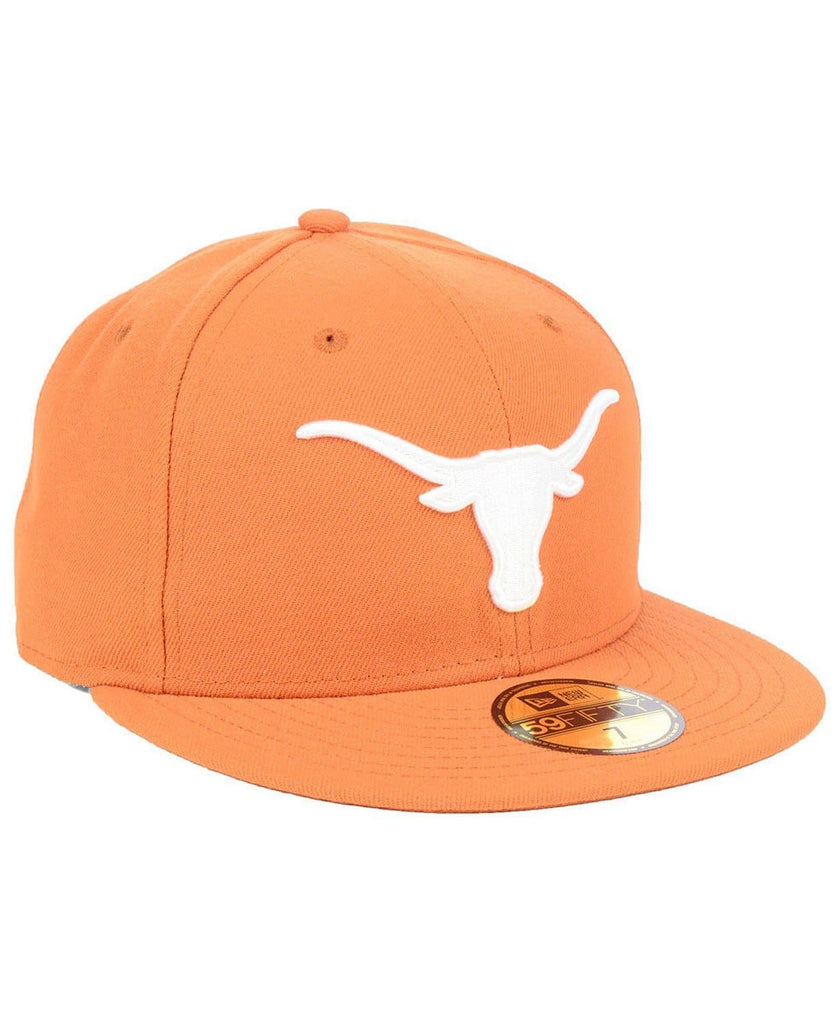 The New Era Texas Longhorns 59Fifty fitted hat has a peach and white colorway. The structured 6 panel high crown, the embroidered eyelets and fabric squatchee button are peach in color. The flat brim of the fitted is also peach. The front logo depicts the Texas Longhorns team logo embroidered in white thread. The back of the fitted displays the wordmark "Texas" in white thread and the New Era logo on the left panel is embroidered in white thread as well. Great fitted hat for students of the University of Texas and supporters of the NCAA football team Texas Longhorns .