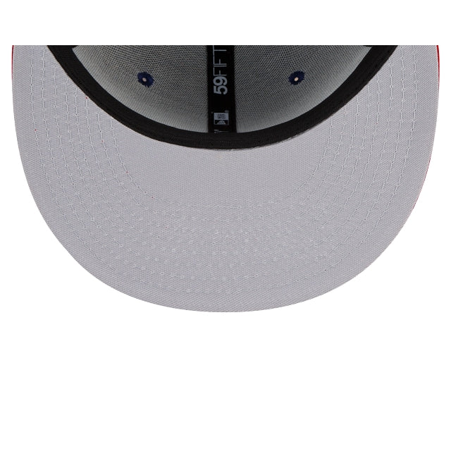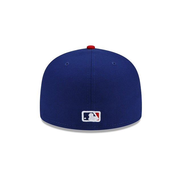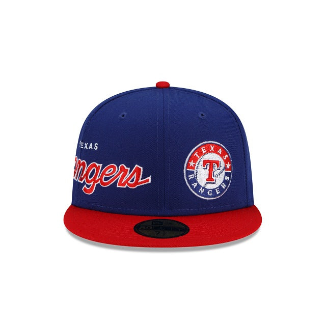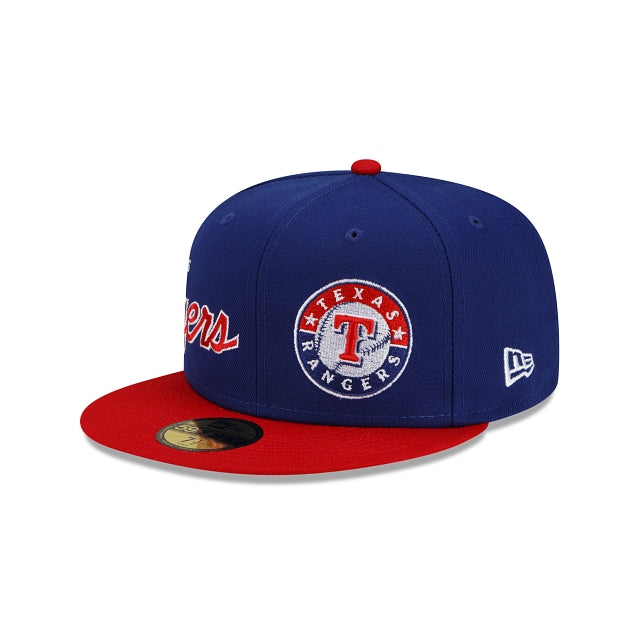 The Texas Rangers Double Logo 59FIFTY Fitted Cap features a two tone team fabrication with an embroidered Rangers logo at the front left-wear panel, complimented by a team script at the right-wear side and a matching MLB Batterman logo at the rear.