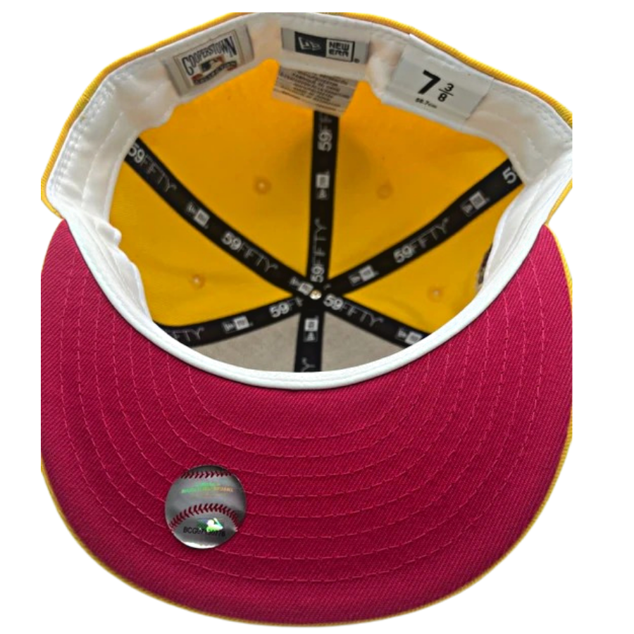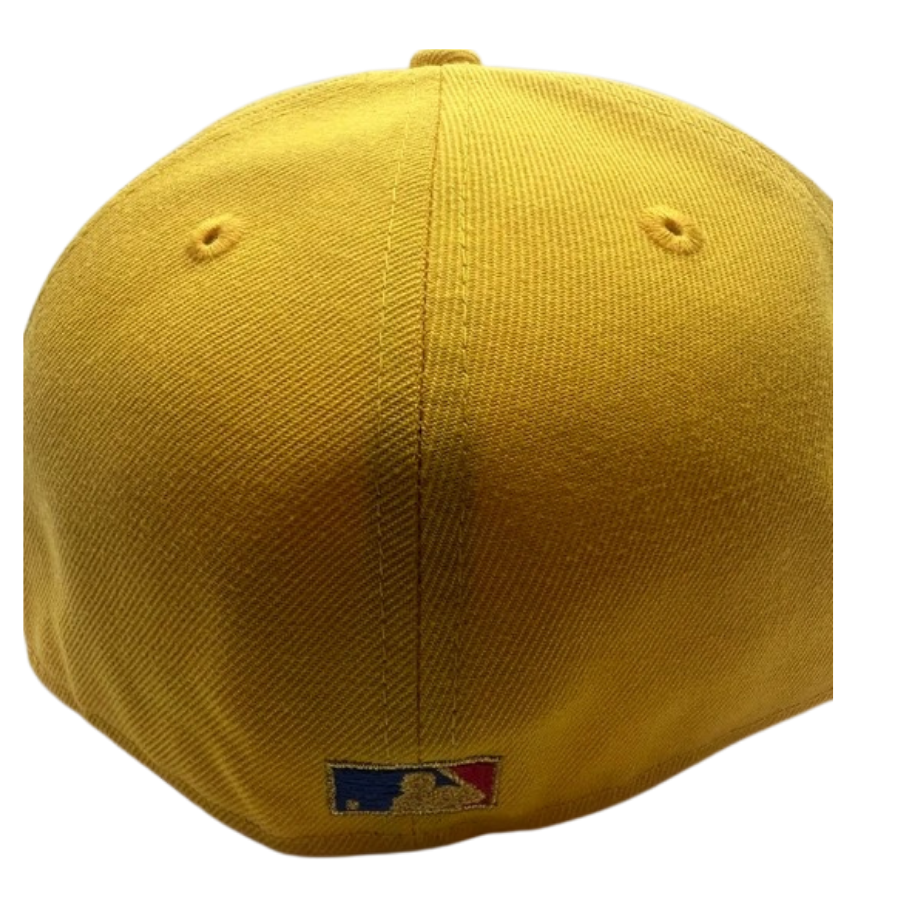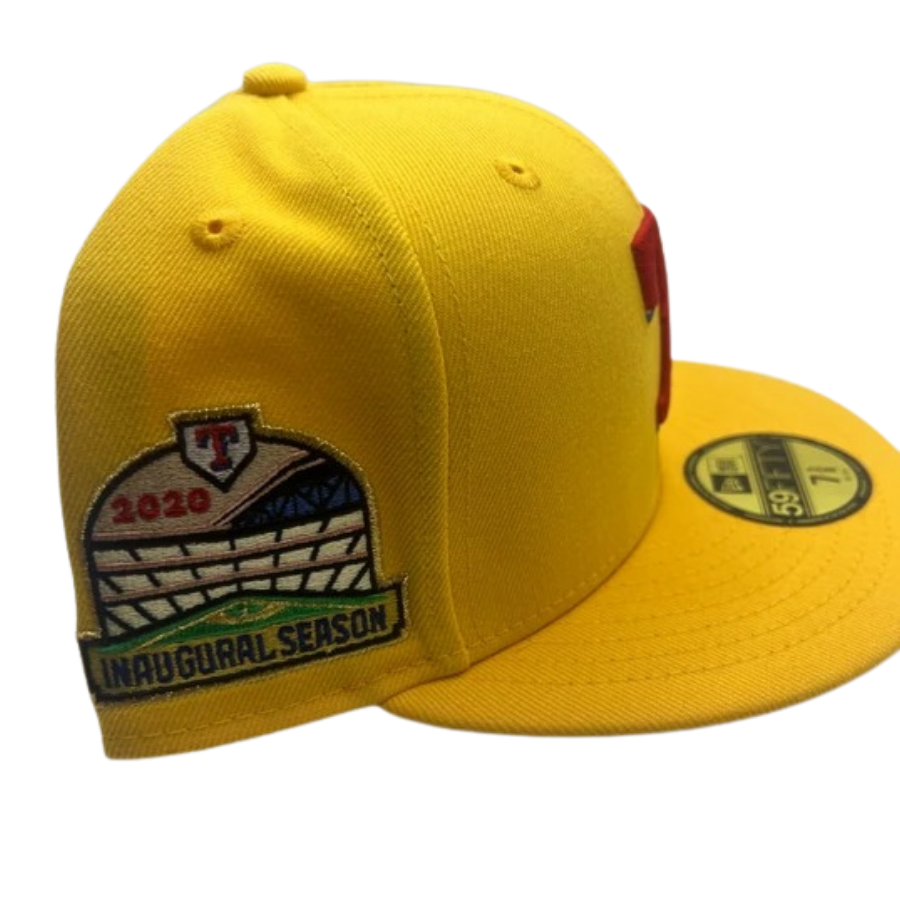 The New Era Texas Rangers "Toblerone Swiss Milk Chocolate Raisins, Honey & Almond Nougat" inspired fitted hat is a My Fitteds exclusive release part of the Toblerone Pack. The fitted features a merigold six panel structured high crown, embroidered eyelets and fabric squatchee button. The flat bill of the fitted is also merigold with a red undervisor and a white sweatband. The front panel features the Texas Rangers logo embroidered in red thread outlined in blue thread. The fitted hat colorway was inspired by the Toblerone Swiss Milk Chocolate Raisins, Honey & Almond Nougat candy bar owned by Mondelēz International.