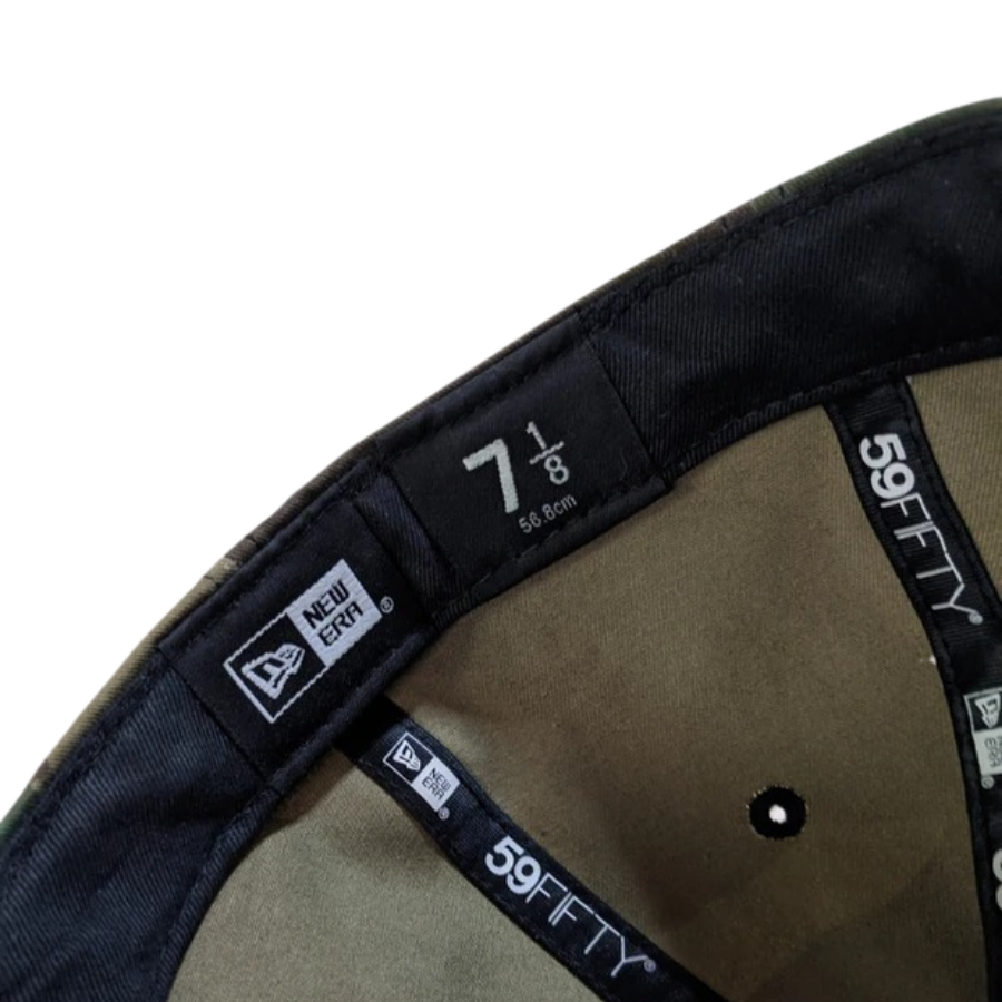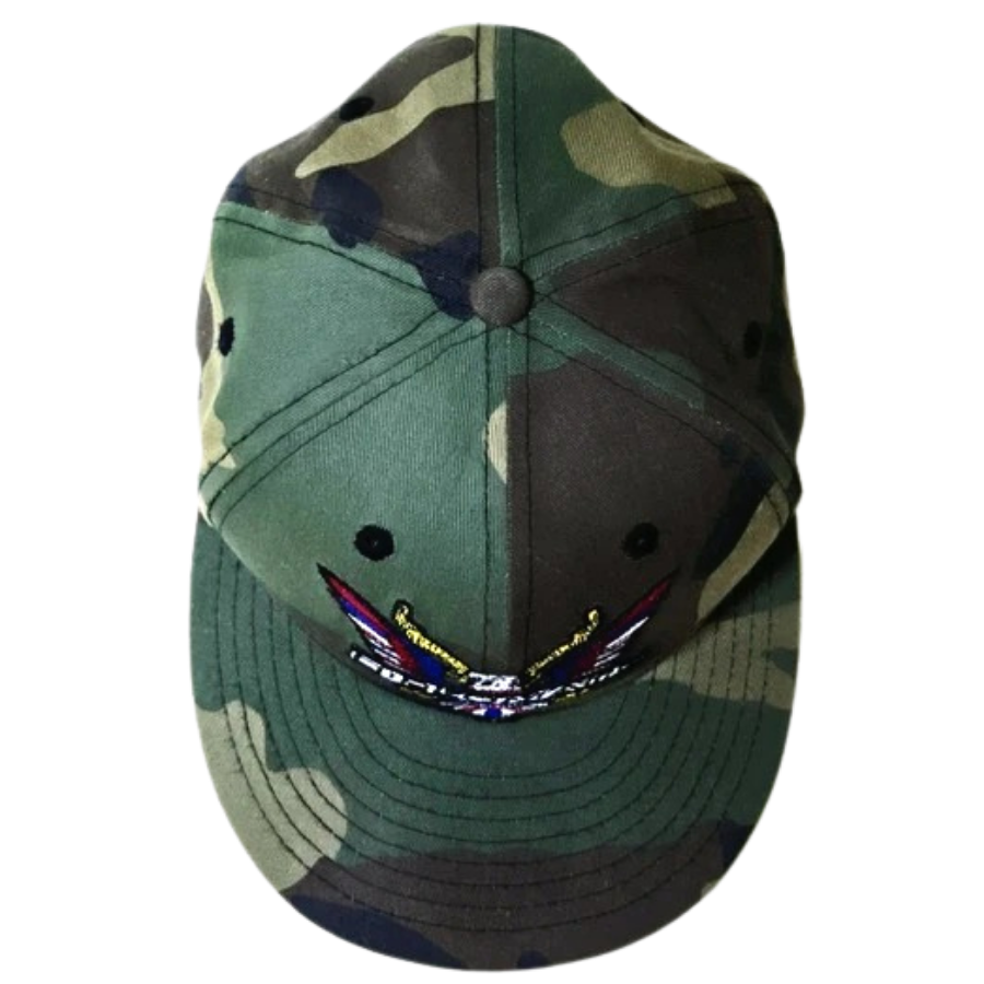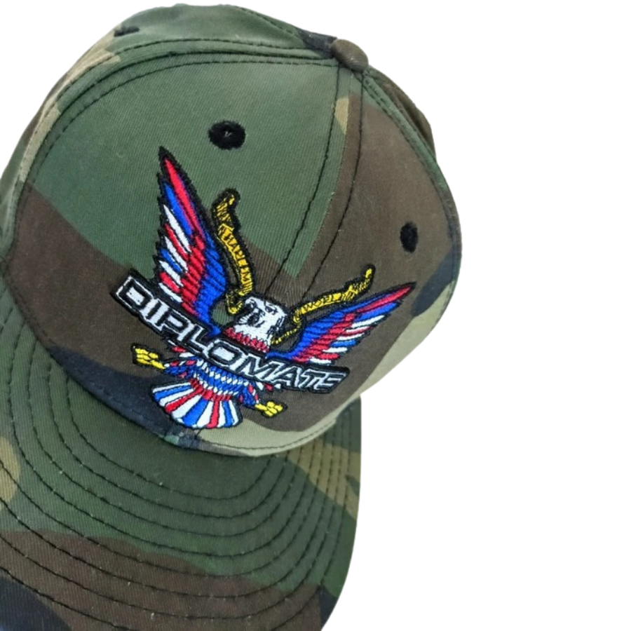 The Diplomats "Dipset" 59FIFTY fitted hat has a camouflage colorway. The six panel structured high crown, embroidered eyelets and fabric squatchee button are camo pattern. The flat bill of the fitted cap is also camo with a black sweatband. The front panel features the Hip Hop rap group "The Diplomats" aka Dipset logo embroidered in red, white, blue and yellow. Dipset was formed in 1997 in New York City. Members included in the legendary group includes