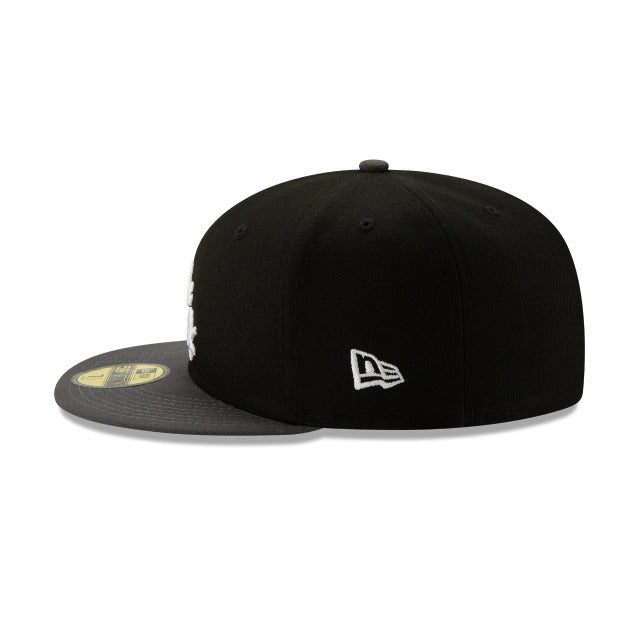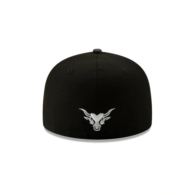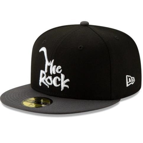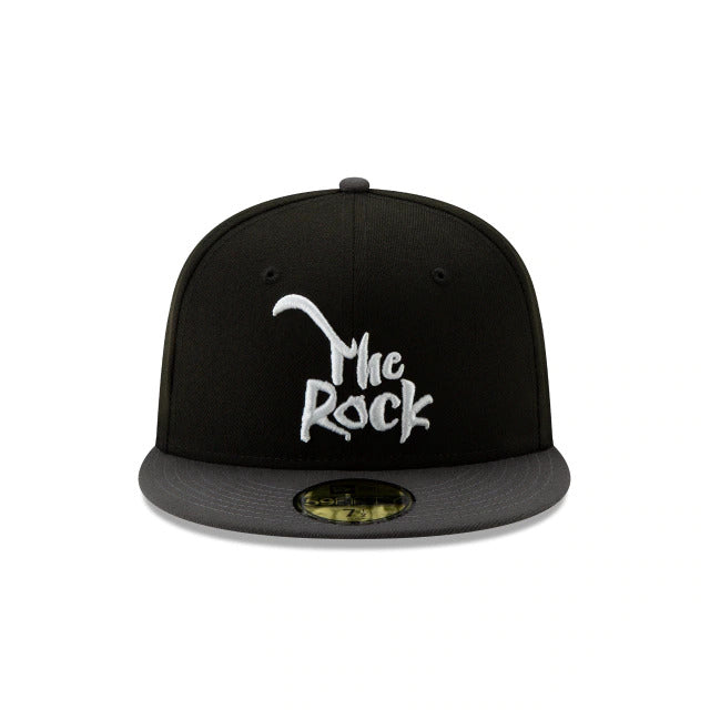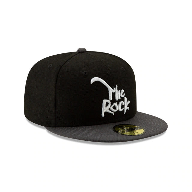 The New Era The Rock WWE fitted hat has a black and white colorway. The six panel structured high crown, embroidered eyelets and fabric squatchee button are black. The flat bill of the fitted is also black. The front panel features the word "The Rock" in a stylized wordmark embroidered in white thread. The back of the crown features The Rock bull logo embroidered in white thread as well. The Rock New Era fitted cap is a great cap for those who are fans of the wrestler and WWE.