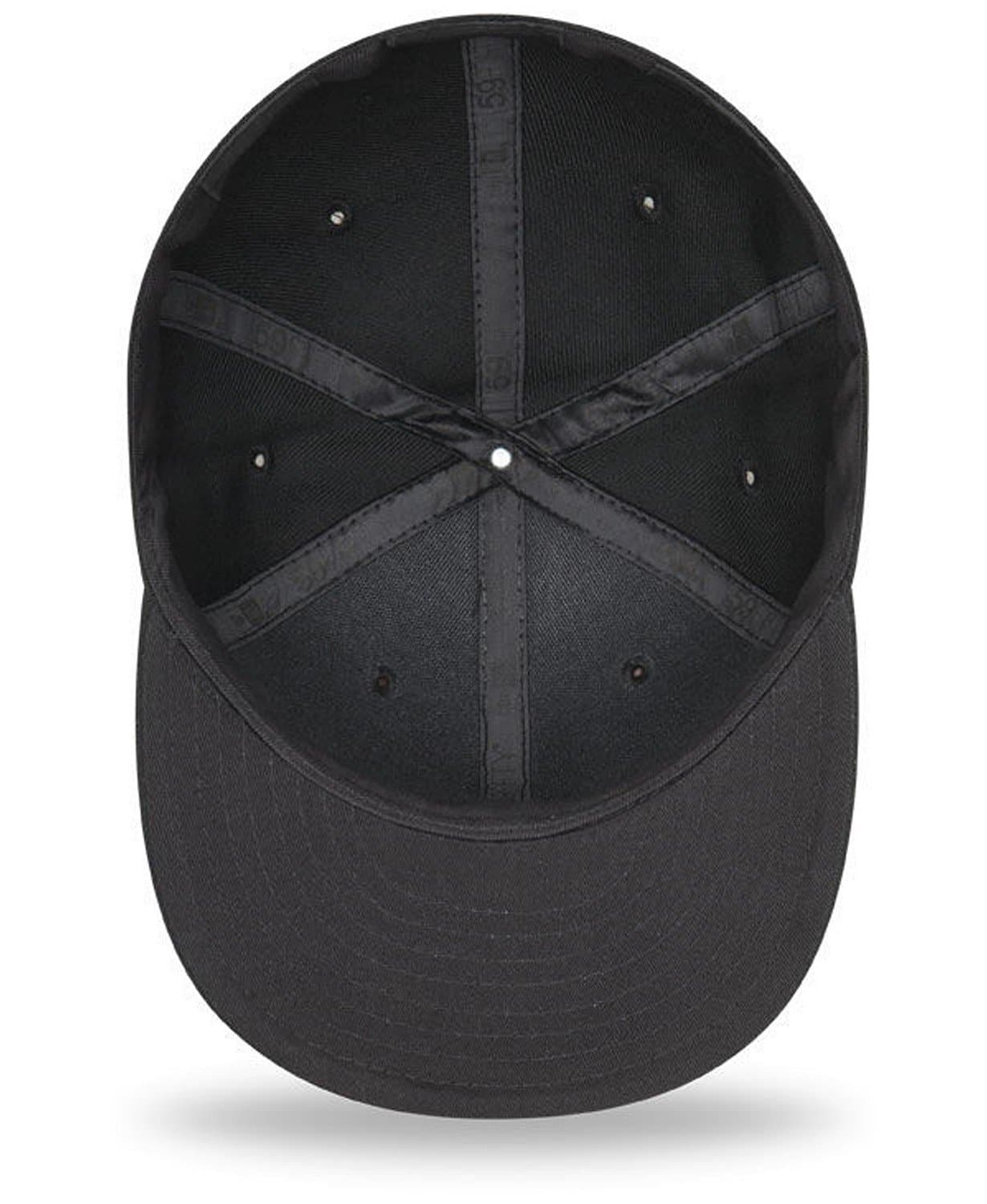 The Toronto Blue Jays Blackout fitted hat has a solid black high structured crown and squatchee button at the top. On the front of the fitted is the embroidery of the official Toronto Blue Jays logo in nontraditional colors.The logo is solid black with the Canadian leaf being a vibrant red that stands out. On the back of the Blue Jays Blackout fitted is the official MLB logo embroidered in solid black. On the left side of the hat is the iconic New Era flag embroidered in black and entire brim of the hat is a solid black. The Blackout theme is truly a pure black fitted hat with even the inside seam, the 59Fifty pattern across the inside of the crown and sweatbands also being a solid black.