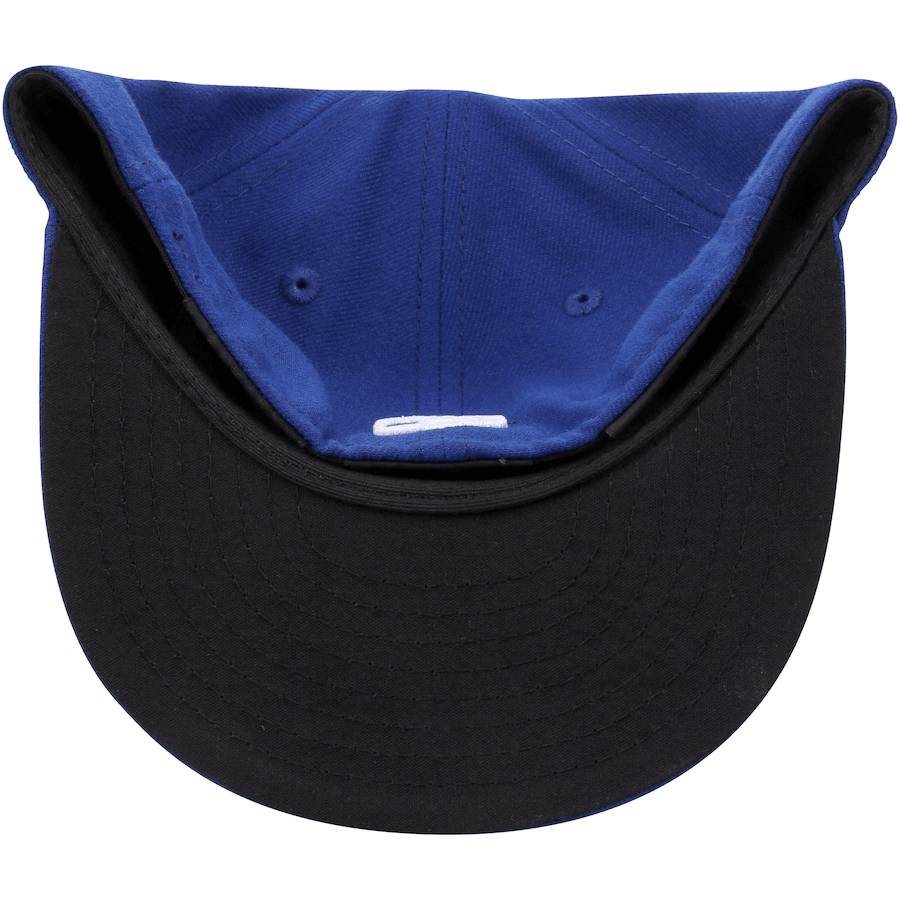 This is a New Era Toronto Blue Jays 59Fifty fitted hat for toddlers. The entire 6 panels of the fitted is Royal blue including the squatchee button. On the front panel is the Toronto Blue Jays logo embroidered in Royal blue, black, white and red threads. The over brim of the fitted is Royal blue with black bottoms. On the backside of the fitted hat is the MLB official logo in embroidered in Royal blue, white and black threads. On the left is the iconic New Era flag embroidered in red thread.