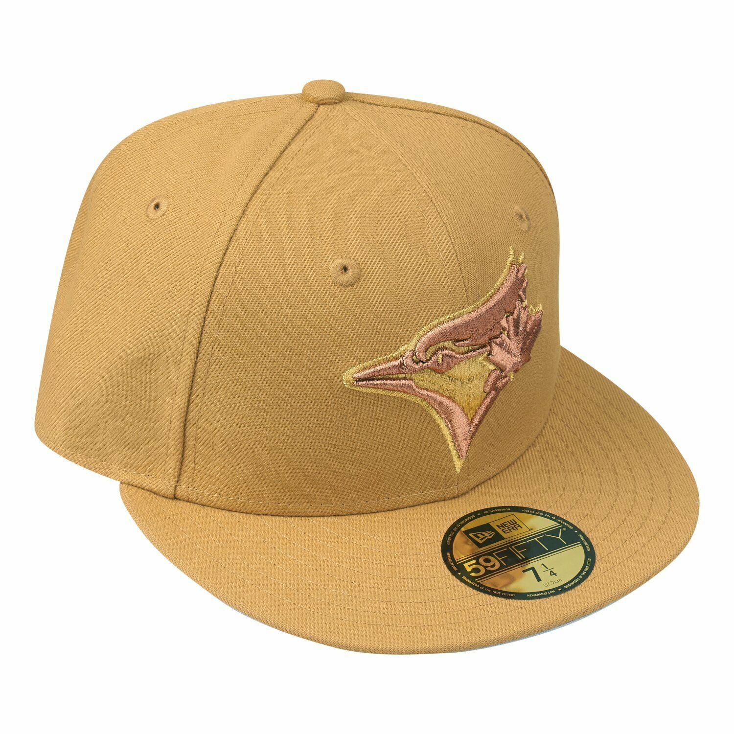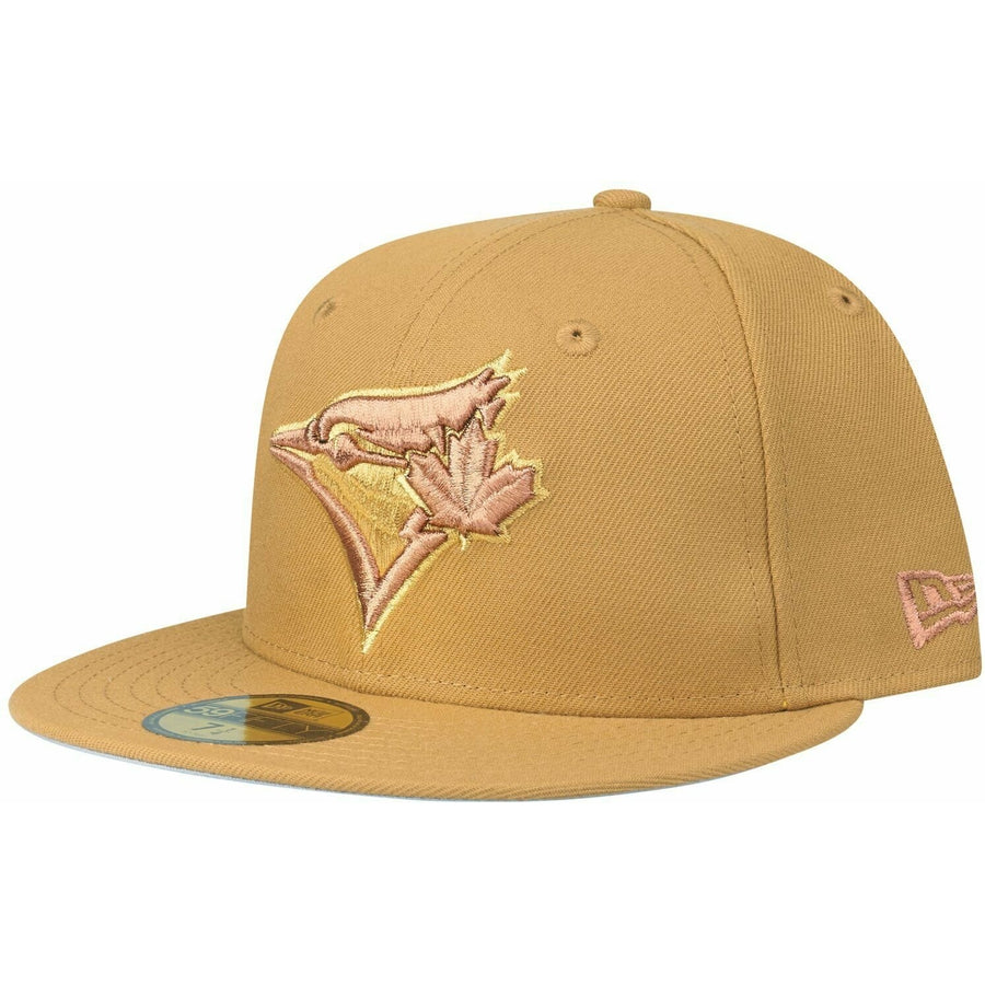 This New Era Toronto Blue Jays fitted hat has a Panama Tan colorway. The six panel structured high crown, embroidered eyelets and fabric squatchee button are Panama Tan. The flat bill of the fitted is also Panama tan with a grey undervisor and black sweatband.