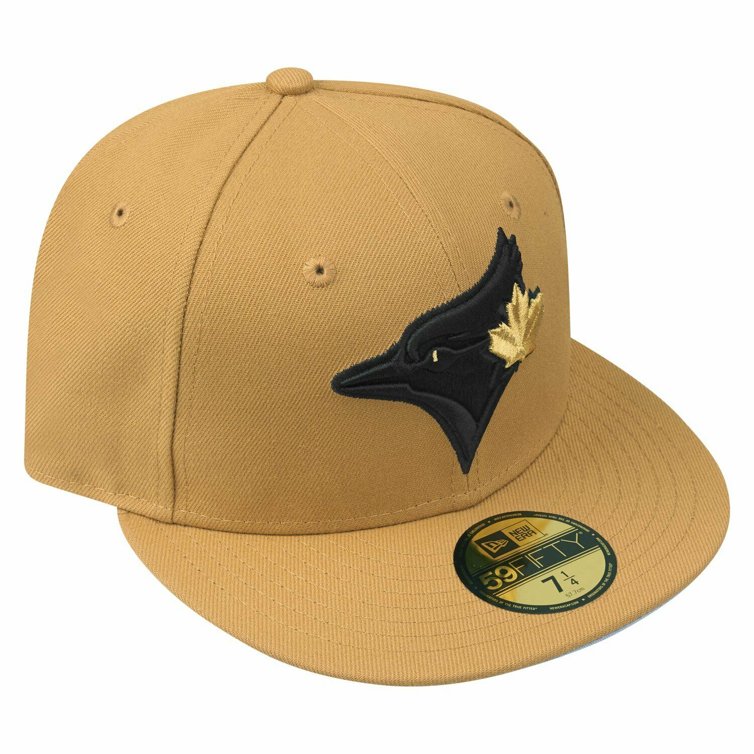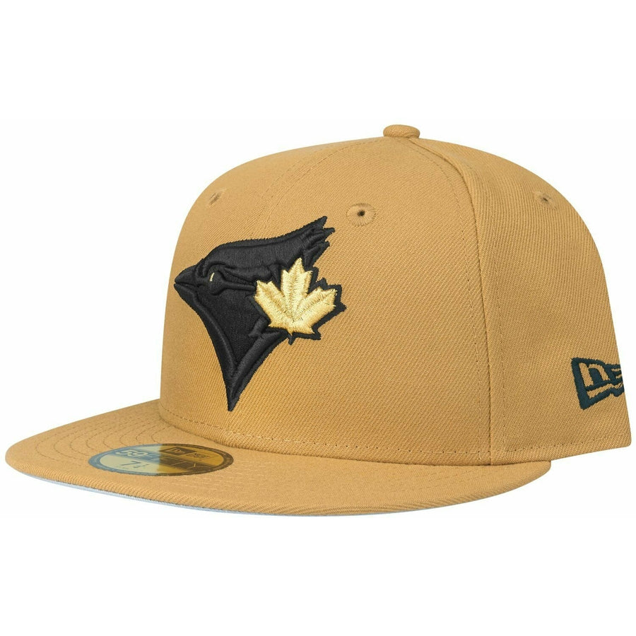 This New Era Toronto Blue Jays fitted hat has a Panama Tan/Black colorway. The six panel structured high crown, embroidered eyelets and fabric squatchee button are Panama Tan. The flat bill of the fitted is also Panama tan with a grey undervisor and a black sweatband.