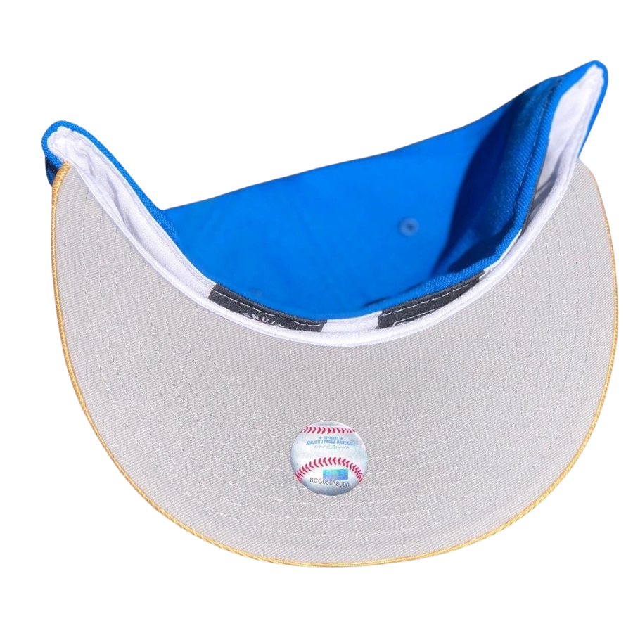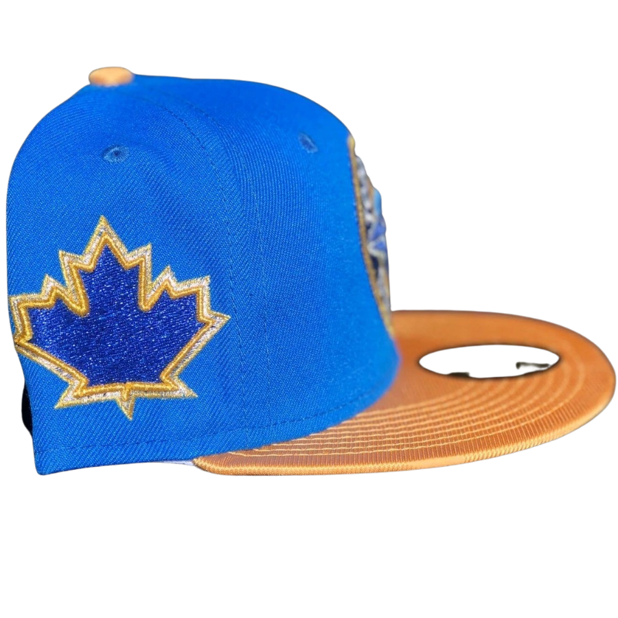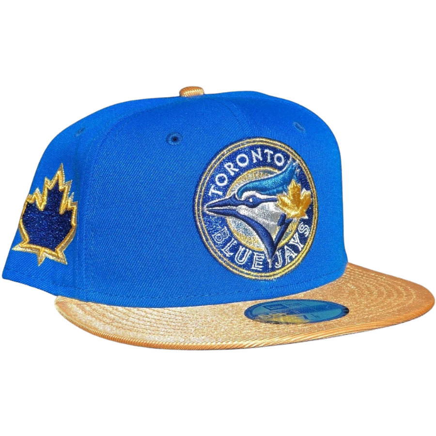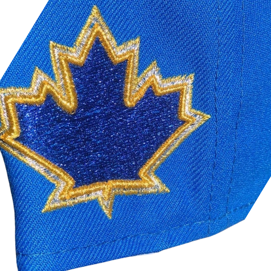 This New Era Toronto Blue Jays "Rolex Submariner Sunburst" inspired fitted hat is a My Fitteds exclusive release. The fitted cap has a royal blue six panel structured high crown and embroidered eyelets with a gold tone fabric squatchee button. The flat bill of the fitted is metallic gold with a grey undervisor and white sweatband. The front panel features the Toronto Blue Jays logo embroidery with a Canadian leaf side patch embroidered on the right panel. This fitted cap colorway was inspired by the Rolex Submariner Sunburst luxury watch.