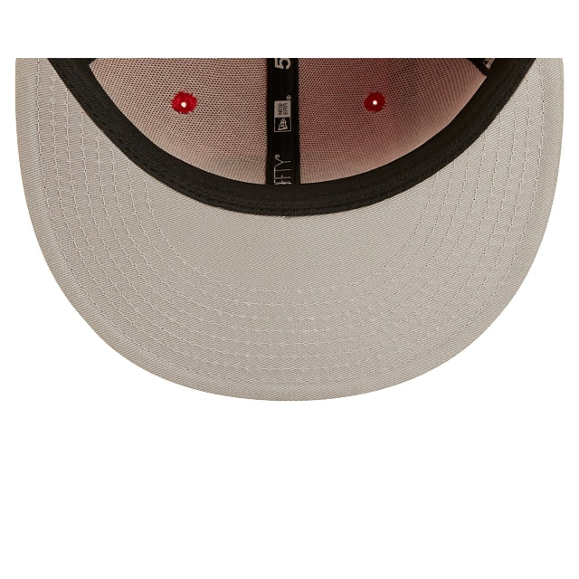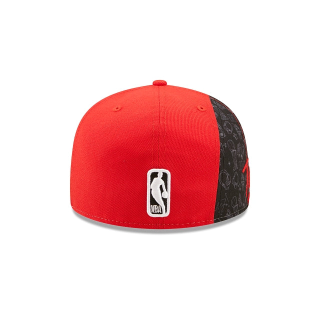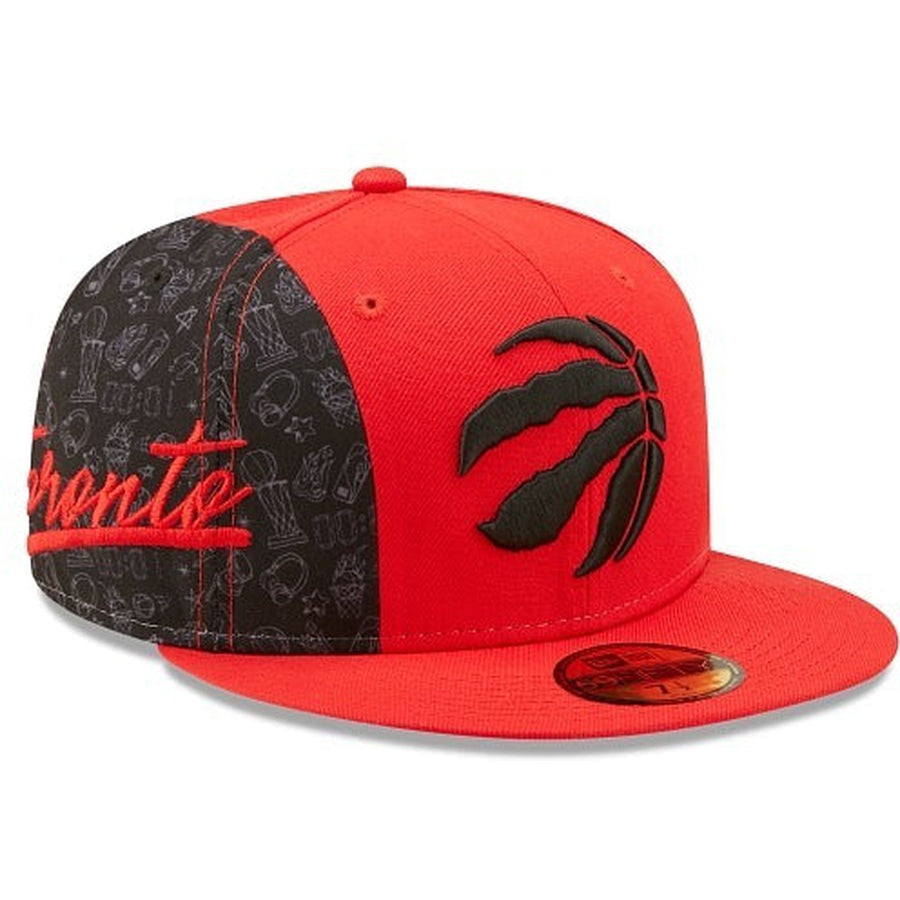 The Toronto Raptors Side City Doodle 59FIFTY Fitted Cap features an embroidered Raptors logo at the front panels, a team script with league inspired Doodle at the right-wear side, and a matching NBA logo at the rear.