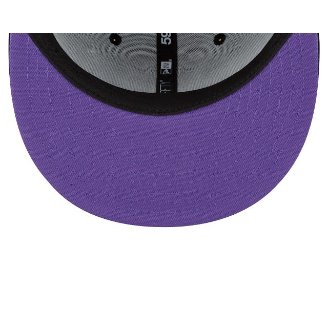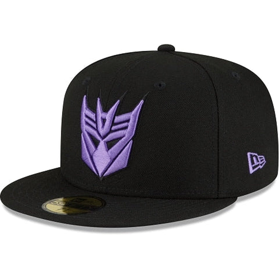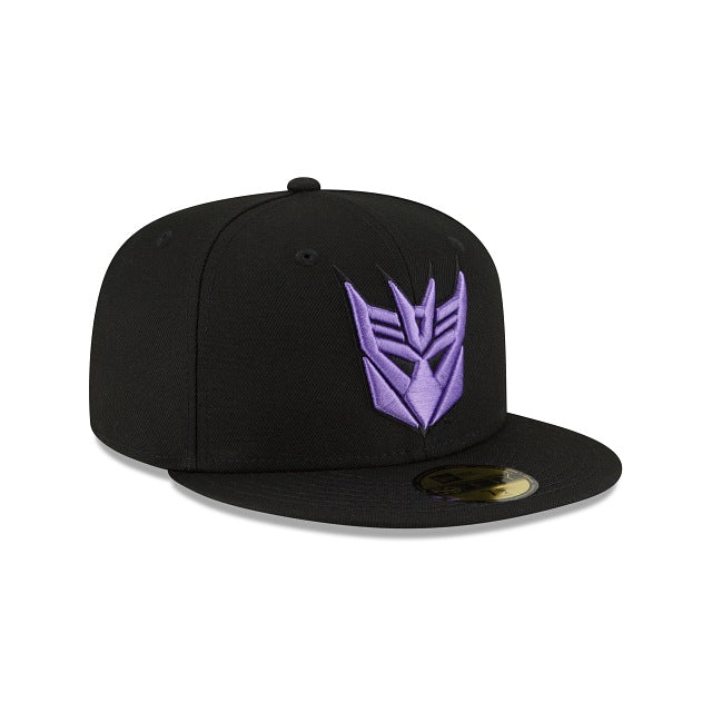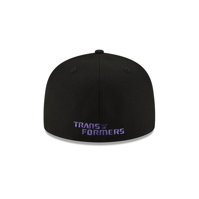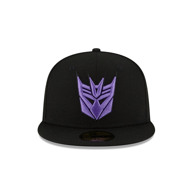 The Transformers Decepticons 59FIFTY Fitted Cap features an embroidered Decepticons logo at the front panels, and a Transformers wordmark at the rear. Additional details include a purple undervisor.