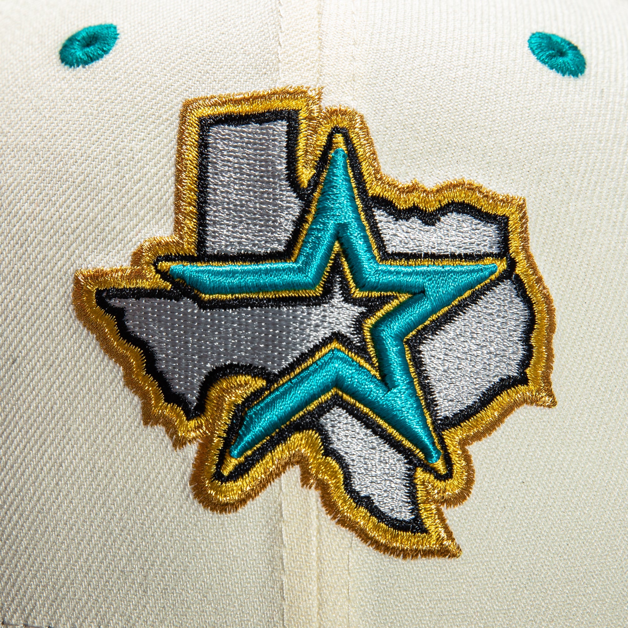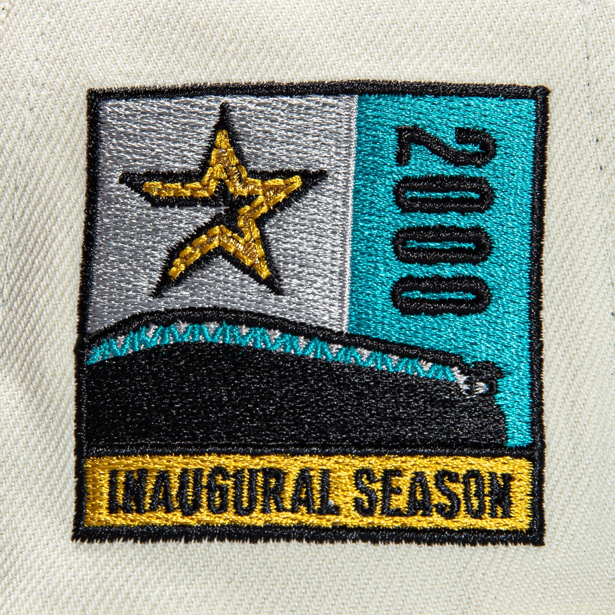 This New Era Tropics Houston Astros 2000 Inaugural 59FIFTY Fitted Hat is a Hat Club exclusive. The fitted has a white six panel structured high crown with teal embroidered eyelets and fabric squatchee button. The fitted cap has a black flat bill with a teal undervisor and black sweatband. The front panel features the Houston Astros logo embroidery and a side patch embroidery on the right panel. The left panel of the fitted displays the New Era logo and the official MLB logo embroidery on the rear crown.