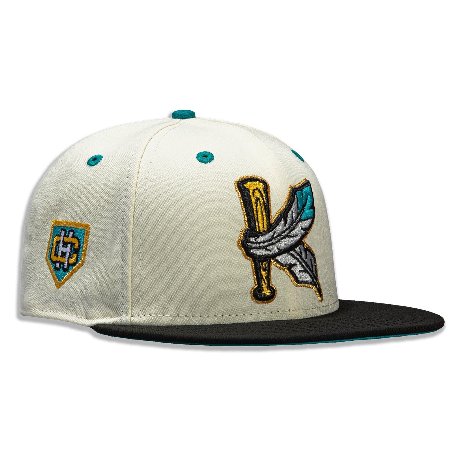 New Era 59Fifty Fitted Hat White Crown Black Visor Teal Undervisor Embroidered Team logo on front HC Patch Embroidered on Right Panel 100% Polyester