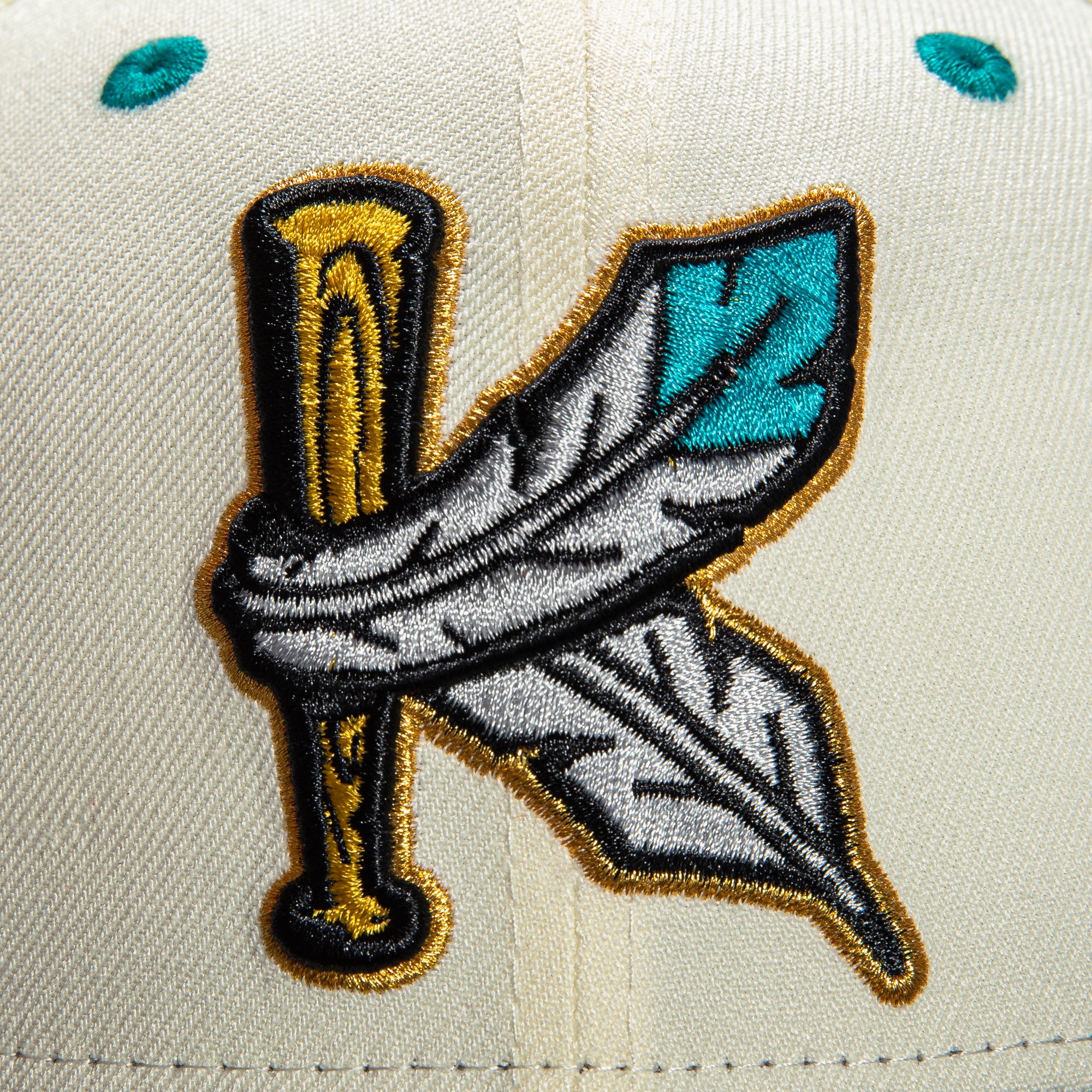 This New Era Tropics Kinston Indians 59FIFTY Fitted Hat is a Hat Club exclusive. The fitted has a white six panel structured high crown with teal embroidered eyelets and fabric squatchee button. The fitted cap has a black flat bill with a teal undervisor and black sweatband. The front panel features the Kinston Indians logo embroidery and a side patch embroidery on the right panel. The left panel of the fitted displays the New Era logo and the official MILB logo embroidery on the rear crown.