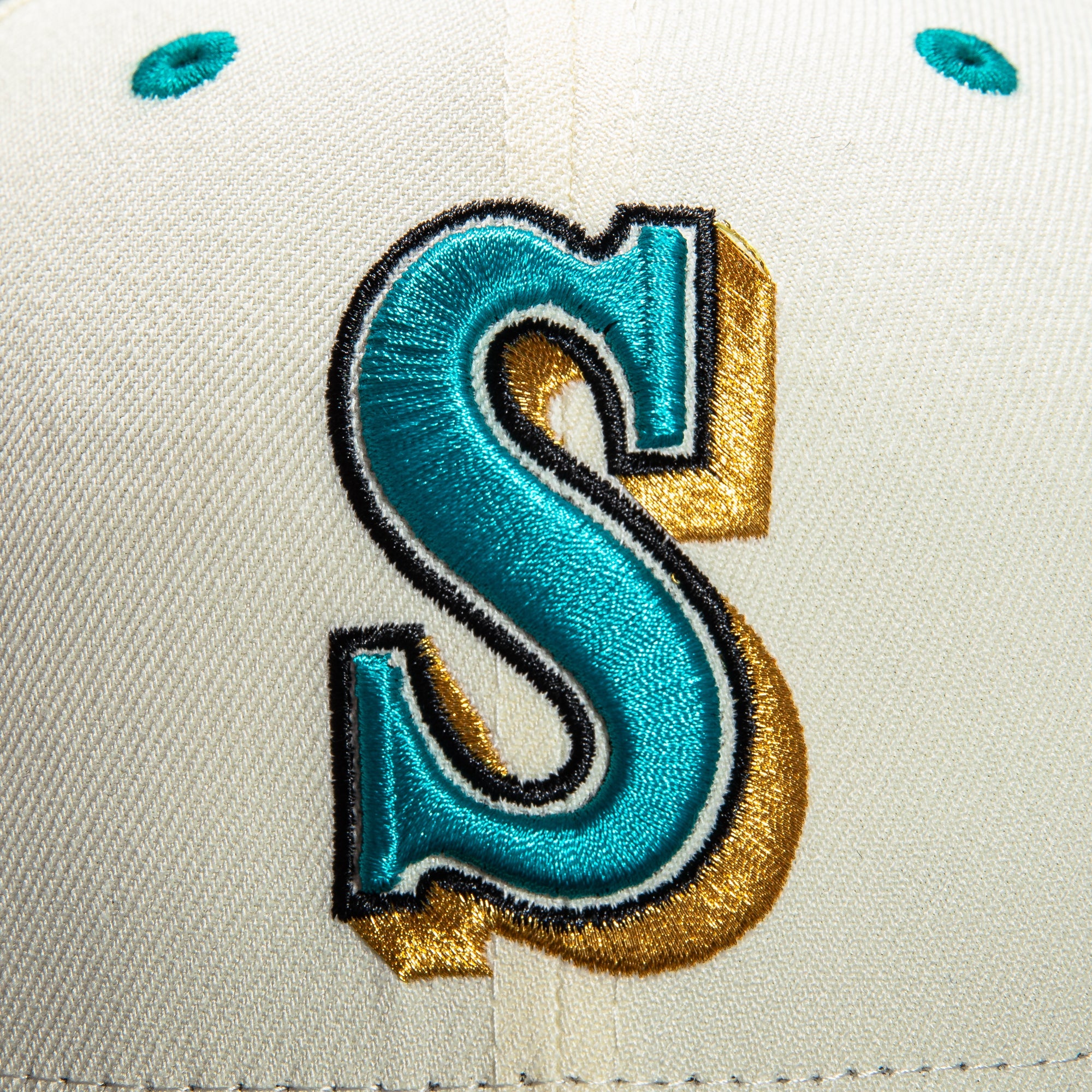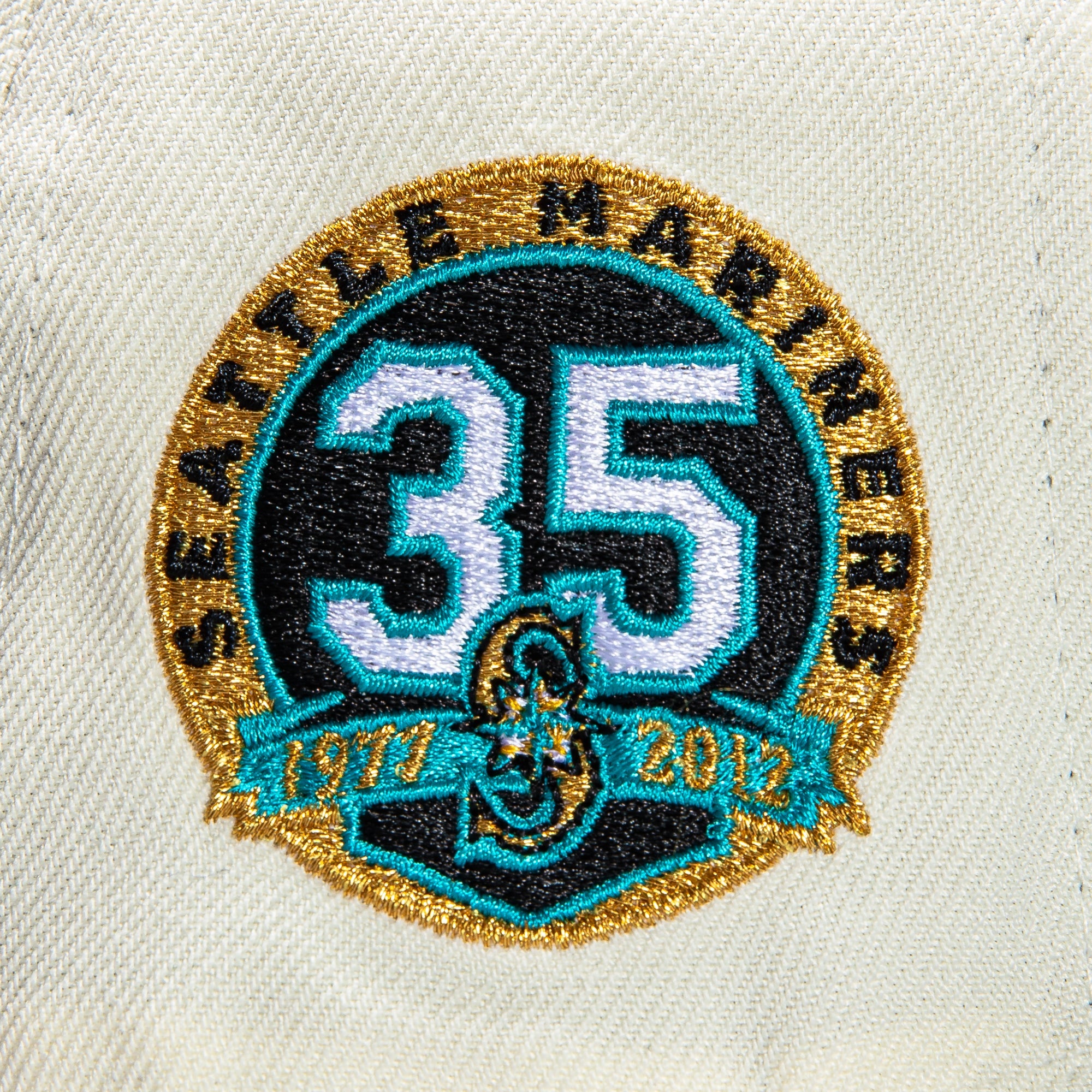 This New Era Tropics Seattle Mariners 35th Anniversary 59FIFTY Fitted Hat is a Hat Club exclusive. The fitted has a white six panel structured high crown with teal embroidered eyelets and fabric squatchee button. The fitted cap has a black flat bill with a teal undervisor and black sweatband. The front panel features the Seattle Mariners logo embroidery and a side patch embroidery on the right panel. The left panel of the fitted displays the New Era logo and the official MLB logo embroidery on the rear crown.