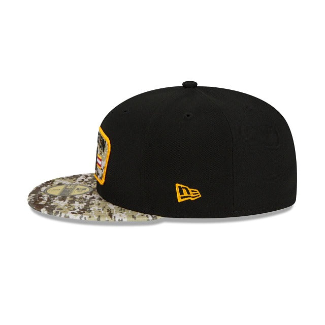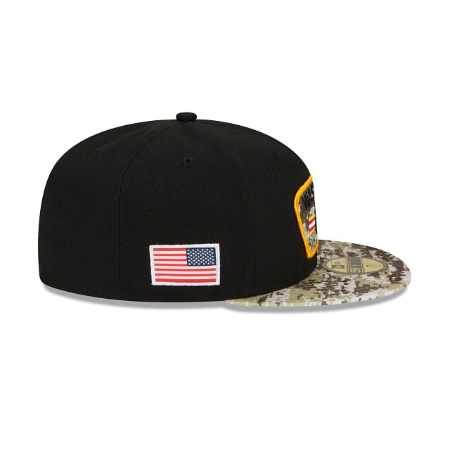 Honor our service members while supporting your favorite team in the Salute To Service 59FIFTY Fitted Cap featuring a two-tone fabrication with an embroidered team patch at the front panels, an embroidered American flag patch on the right-wear side and the official NFL Salute to Service patch on the rear.
