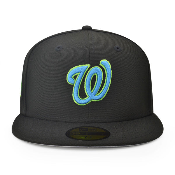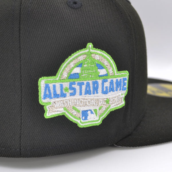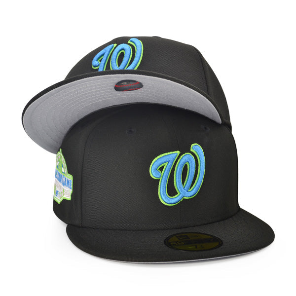 This New Era Washington Nationals 2018 All-Star Game "The Galaxy" 59FIFTY Fitted Hat was released by Hat Dreams. The fitted has a black six panel structured high crown and eyelets with a black squatchee button. The flat bill of the fitted cap is also black with a grey undervisor and a sweatband. The front panel features the Washington Nationals logo embroidered in dolphine blue stitching and a 2018 ASG side patch on the right panel. The left panel of the fitted displays the New Era logo and the official MLB Batterman logo on the rear-crown .
