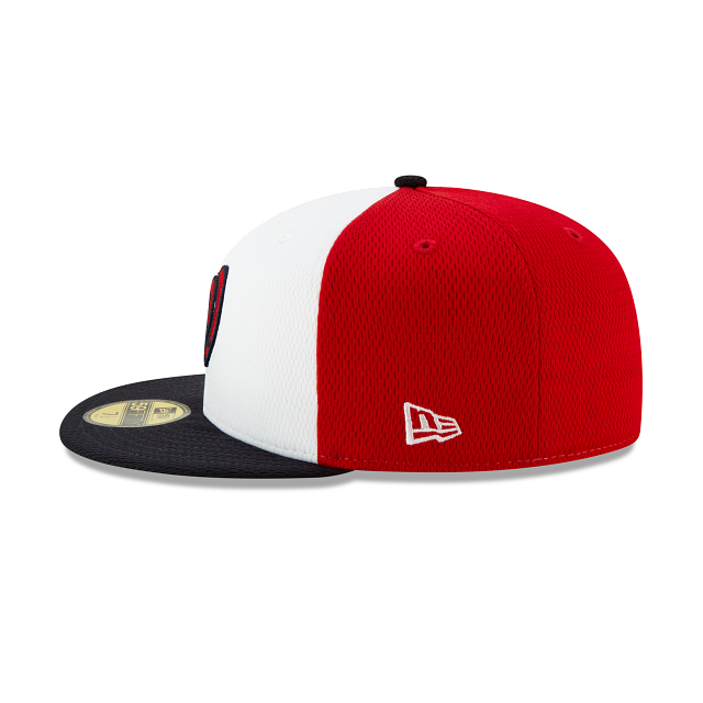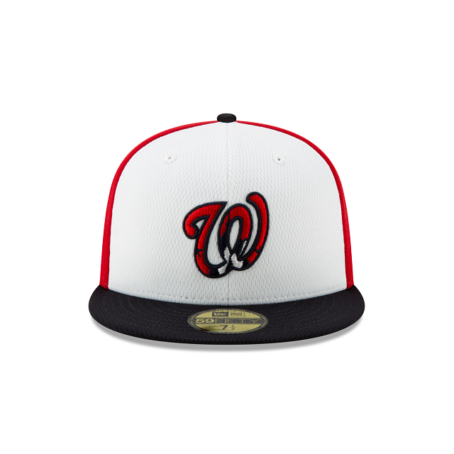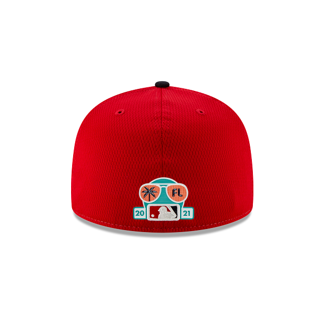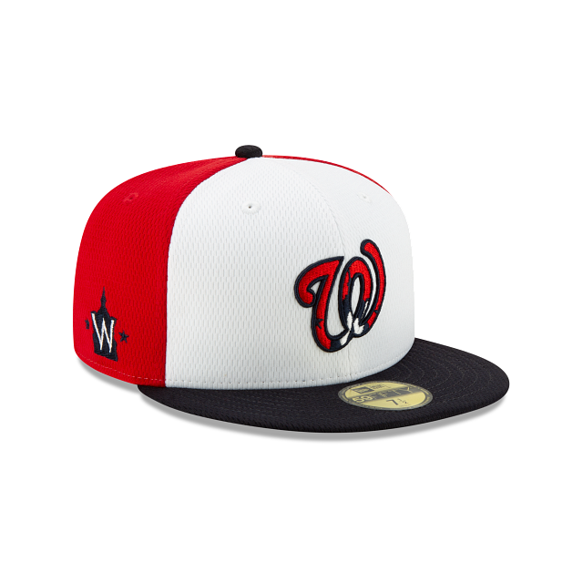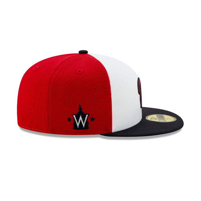 The New Era Washington Nationals Spring Training 59Fifty Fitted Hat has two white panels (and two eyelets) making up the front of the fitted and 4 red panels (4 eyelets) which makes up the back of the high structured crown. The fabric squatchee button on top is black. The brim of the fitted hat is also black. The Washington Nationals logo is embroidered with a side patch on the right. On the left side of the Washington Nationals Spring Training fitted is the iconic New Era logo embroidered in white thread. All of the Spring Training 2021 Collection fitteds have a turquoise figure wearing pink sun glasses on the back of the hat. On the right side of the sunglasses is an insignia special to the teams home state and on the right side of the glasses is the abbreviation of the state. Under this design is the official MLB badge in the middle of the numbers "2021".