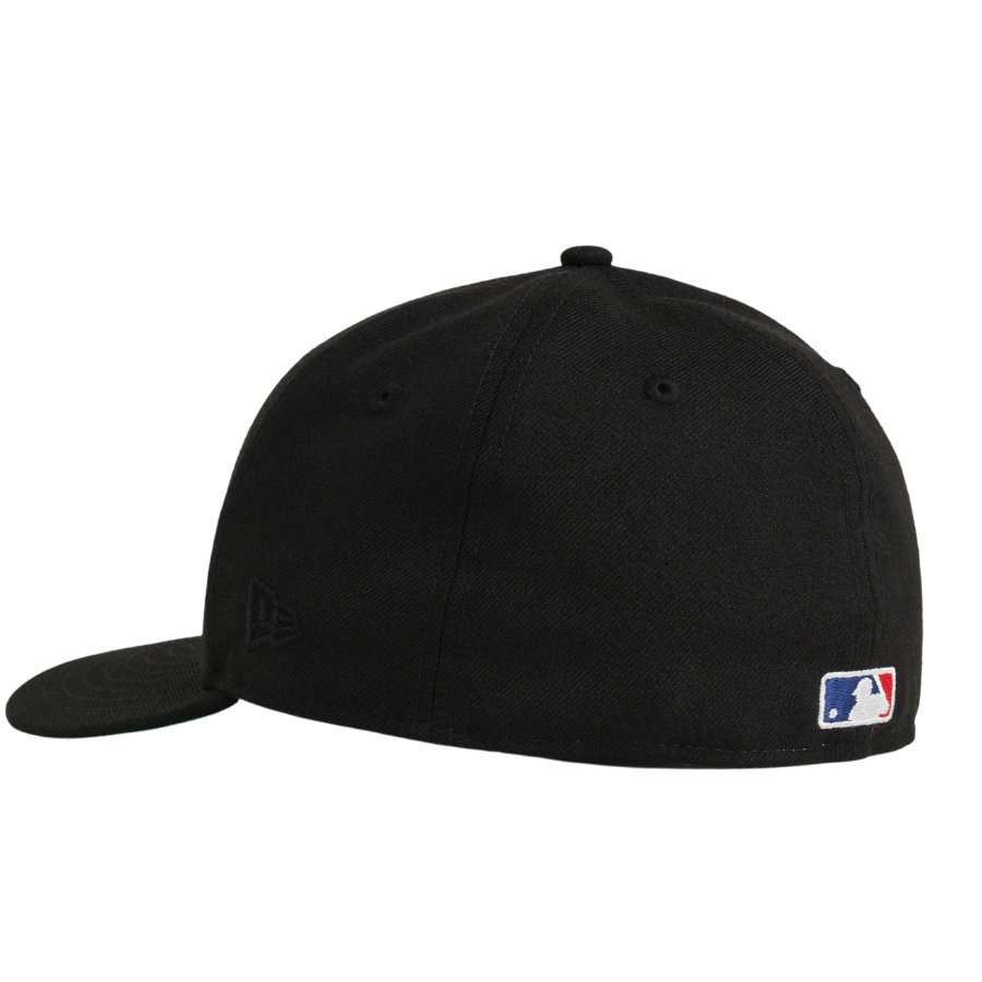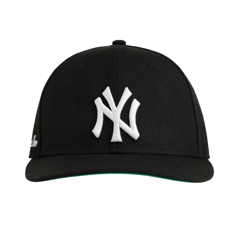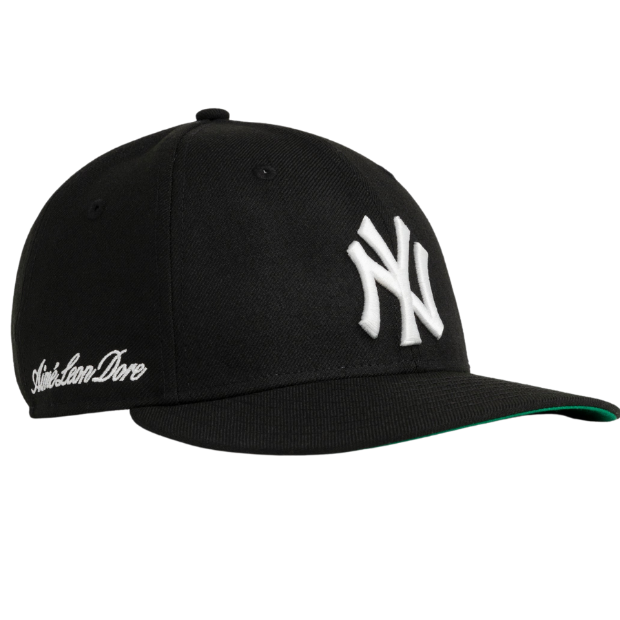 The New Era x Aimé Leon Dore New York Yankees fitted hat has a black and white colorway. The six panel structured high crown, embroidered eyelets and fabric squatchee button are black. The flat bill of the fitted cap is also black with a green undervisor. The front panel features the New York Yankees logo embroidered in white thread. The right panel features the script "Aimé Leon Dore" embroidered in white thread.