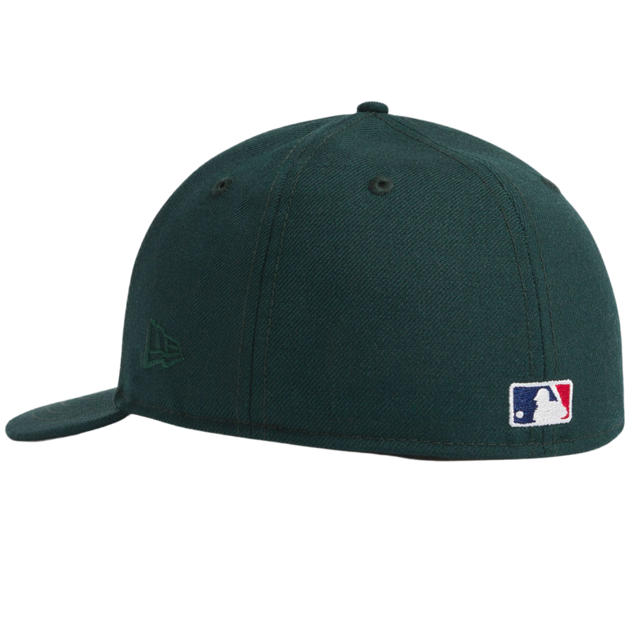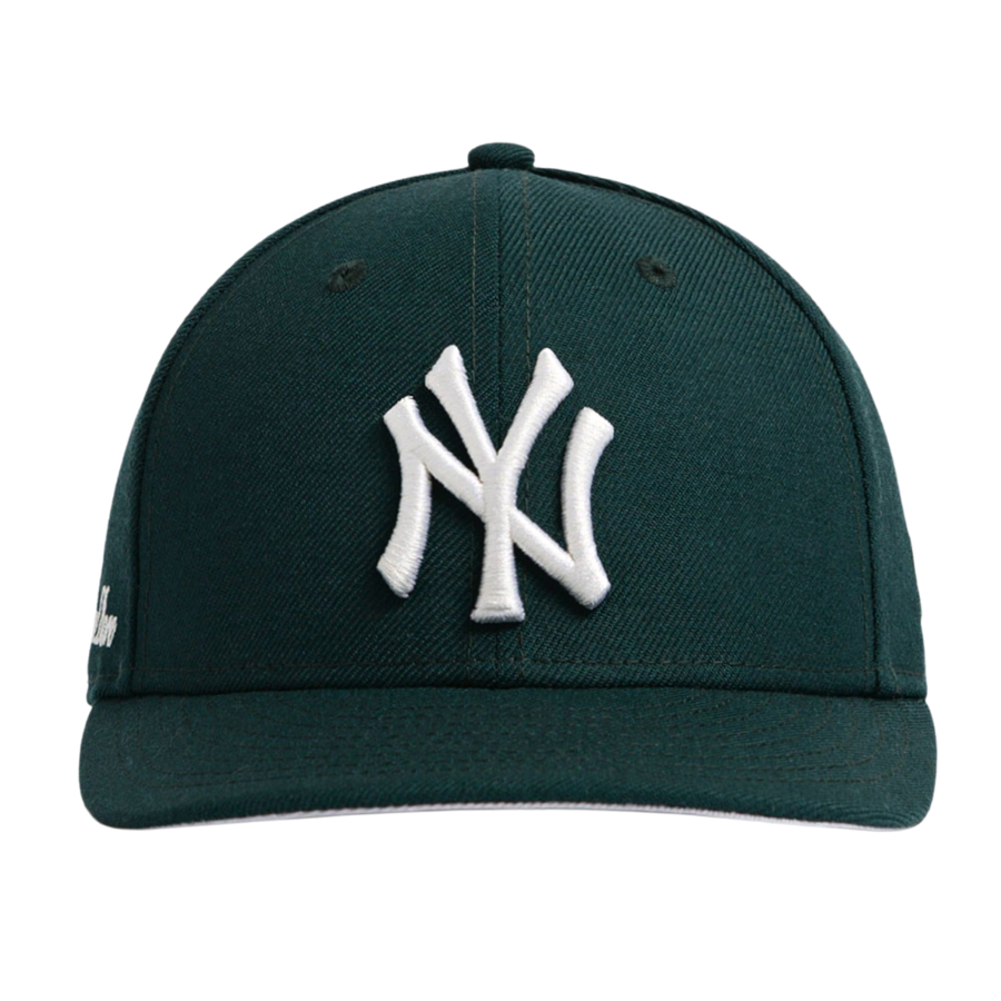 The New Era x Aimé Leon Dore New York Yankees fitted hat has a dark green and white colorway. The six panel structured high crown, embroidered eyelets and fabric squatchee button are dark green. The flat bill of the fitted cap is also dark green with a grey undervisor. The front panel features the New York Yankees logo embroidered in white thread. The right panel features the script "Aimé Leon Dore" embroidered in white thread.