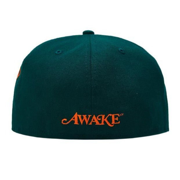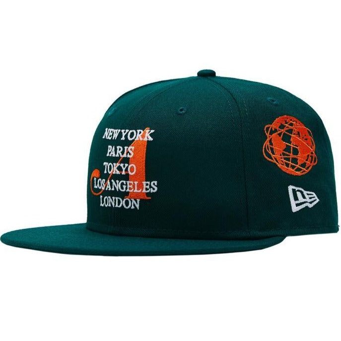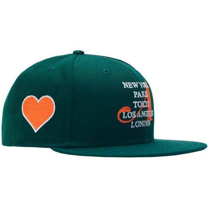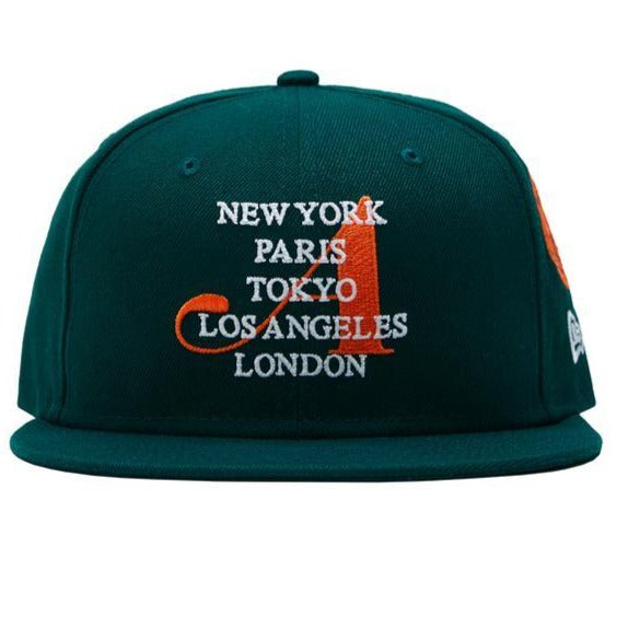Awake Clothing Company. The Award Tour fitted hat features a dark green six panel structured high crown, embroidered eyelets, fabric squatchee button and flat visor. The front panel features the wordmarks "New York, Paris, Tokyo, Los Angeles, London" embroidered in white thread over a large embroidered lettermark A. The right panel features a orange heart embroidery and on the left panel the New Era logo and a orange embroidered globe. The back of the crown features Awake logo embroidered in orange thread.