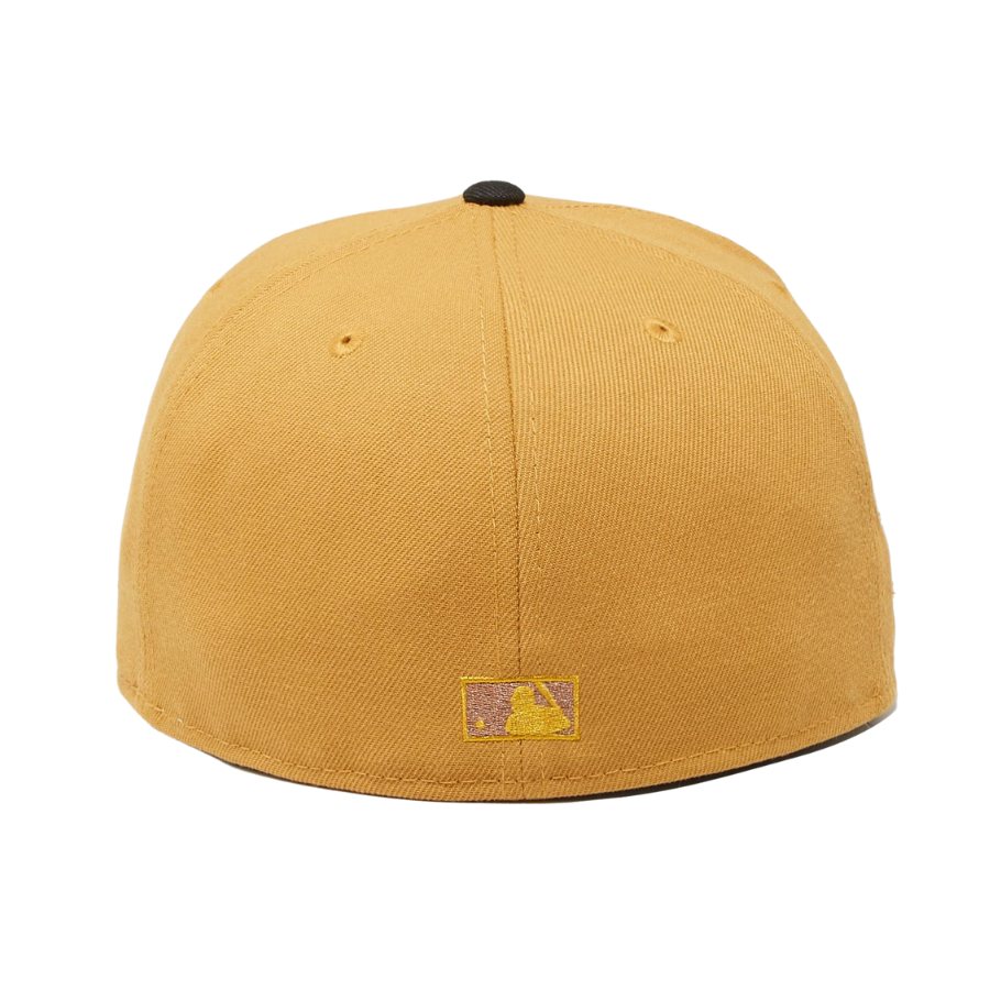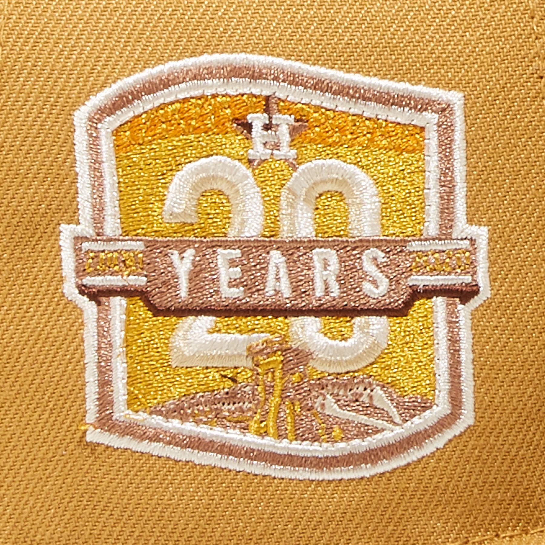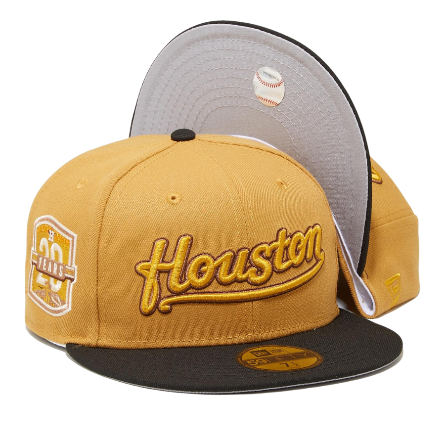 This Houston Astros fitted hat is an exclusive release from Eblens. The fitted has a panama tan six panel structured high crown and embroidered eyelets with a black fabric squatchee button. The fitted cap also has a black flat bill with a grey undervisor and white sweatband. The front panel features the Houston Astros logo embroidery and an Anniversary side patch embroidery on the right panel. The left panel of the fitted displays the New Era logo and the official MLB Batterman logo embroidery on the rear crown.