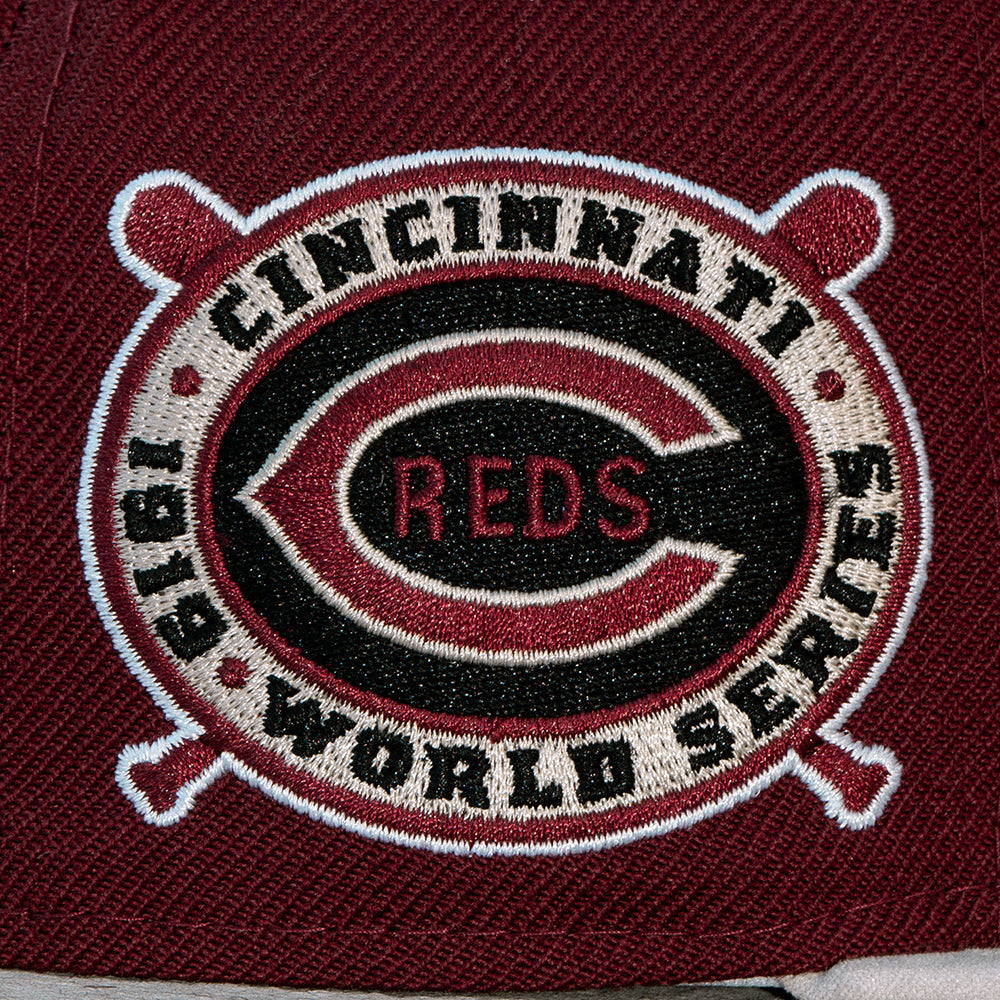 This New Era x FAM Cincinnati Reds 1919 World Series Suede 59FIFTY Fitted Cap was released by FAM. The fitted has a burgundy six panel structured high crown, embroidered eyelets and fabric squatchee button. The fitted cap has a stone (approximate color) flat bill with a kelly green undervisor and white sweatband. The front panel features the Cincinnati Reds logo embroidery and a 1919 World Series side patch embroidery on the right panel. The left panel of the fitted displays the New Era logo and the official MLB logo embroidery on the rear crown.