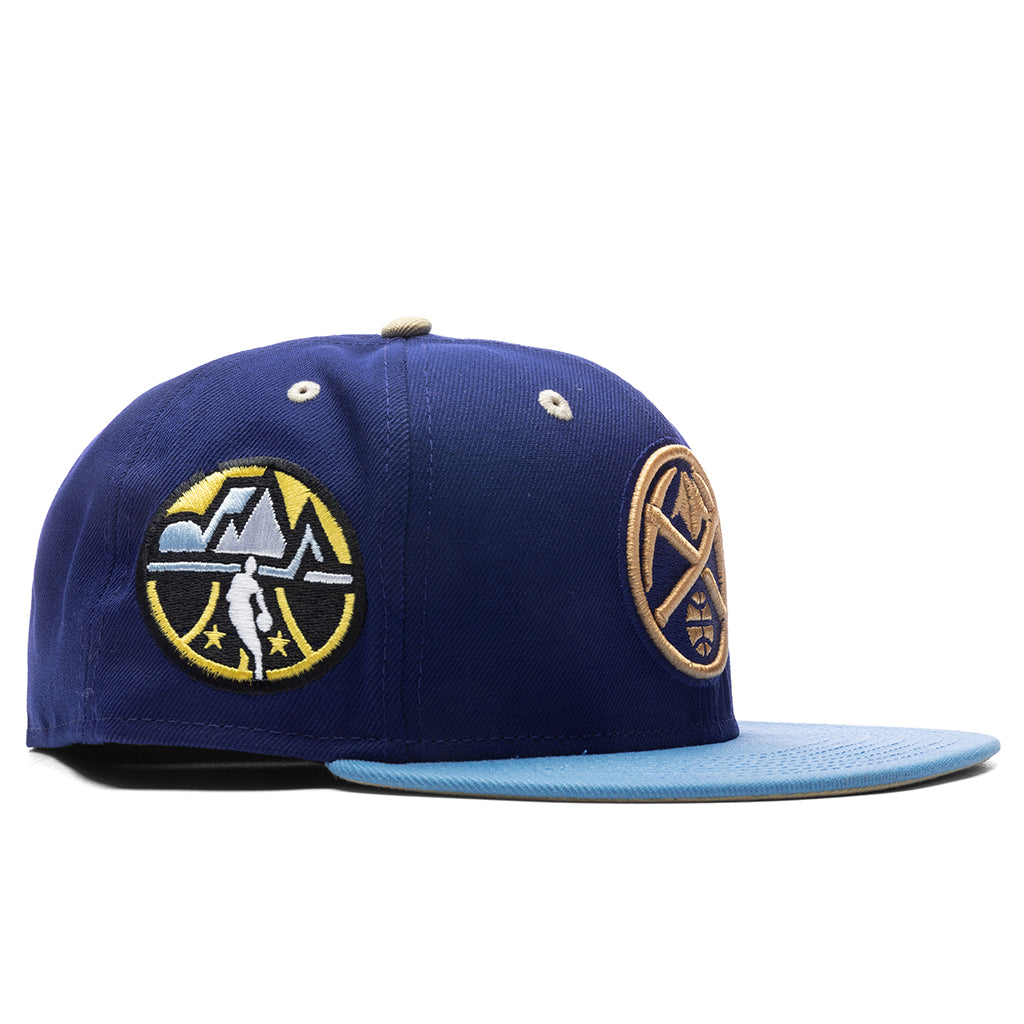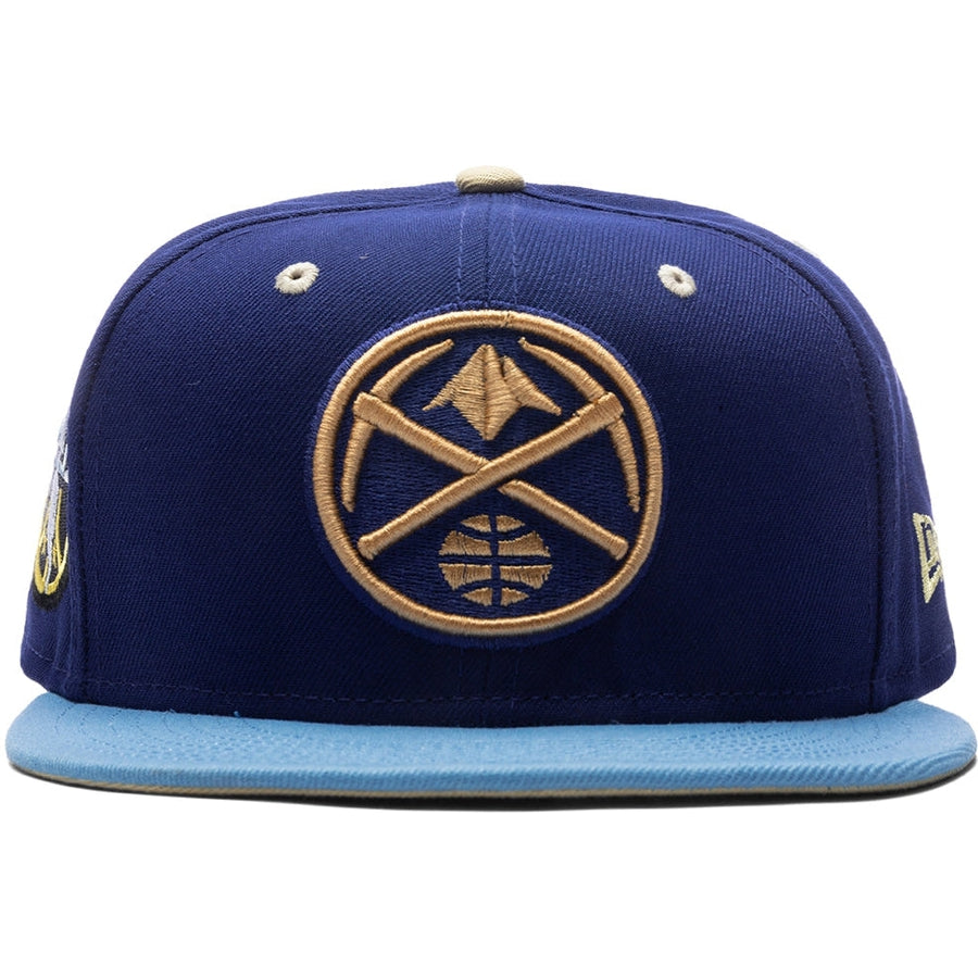 This New Era x Feature Denver Nuggets Navy/Sky/Tan 2023 59FIFTY Fitted Hat was released by Feature. The fitted has a navy blue six panel structured high crown, tan embroidered eyelets and a tan fabric squatchee button. The flat bill of the fitted cap is sky blue with a tan undervisor and black sweatband. The front panel features the Denver Nuggets logo embroidered in navy blue and tan stitching. The left panel of the fitted displays the New Era logo and celebratory side patch on the right panel. The official NBA & Feature logos are embroidered on the rear crown in tan stitching as well.