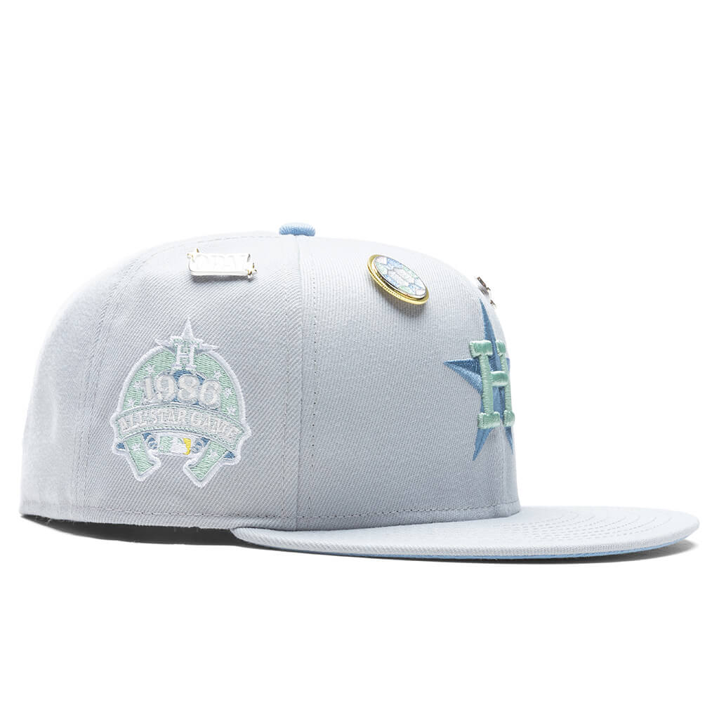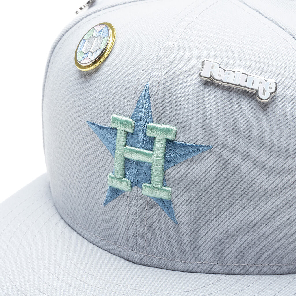 This New Era x Feature Houston Astros "Opal" 59FIFTY Fitted Hat has a light grey six panel structured high crown and embroidered eyelets with a sky blue fabric squatchee button. The fitted cap has a light grey flat bill with a sky blue undervisor and white sweatband. The front panel features the Houston Astros logo embroidery. The left panel of the fitted displays the New Era logo and the official MLB logo embroidery on the rear crown.