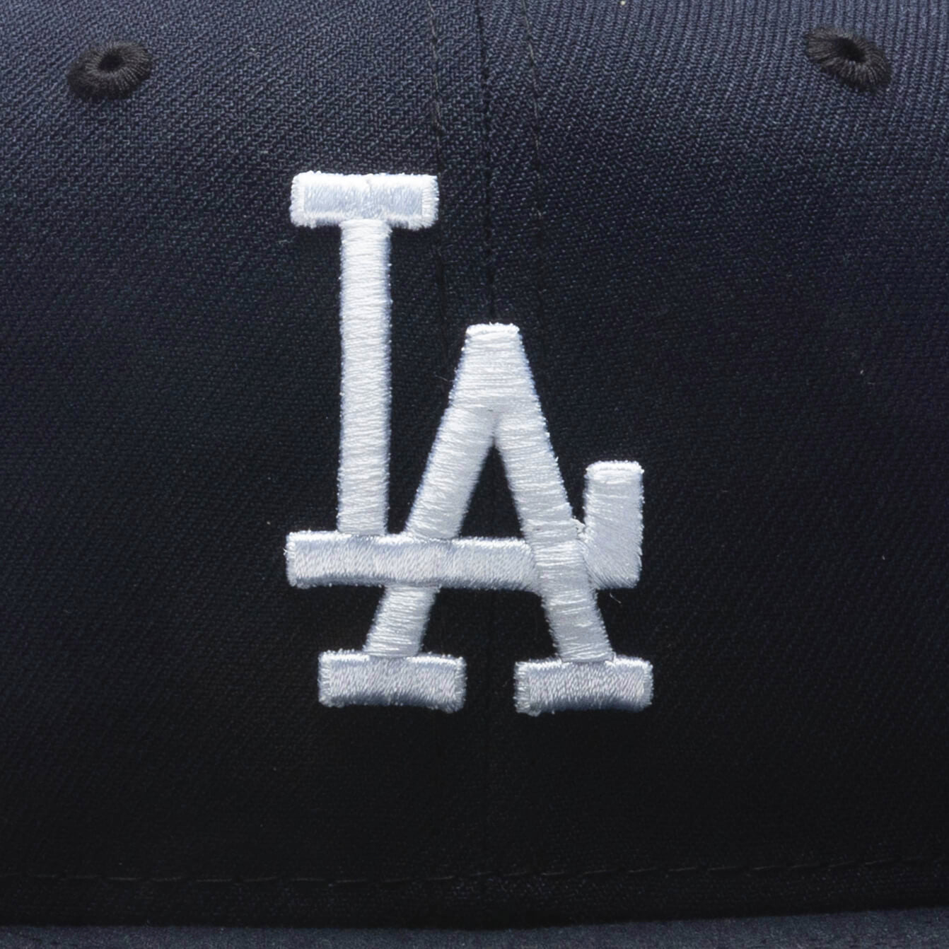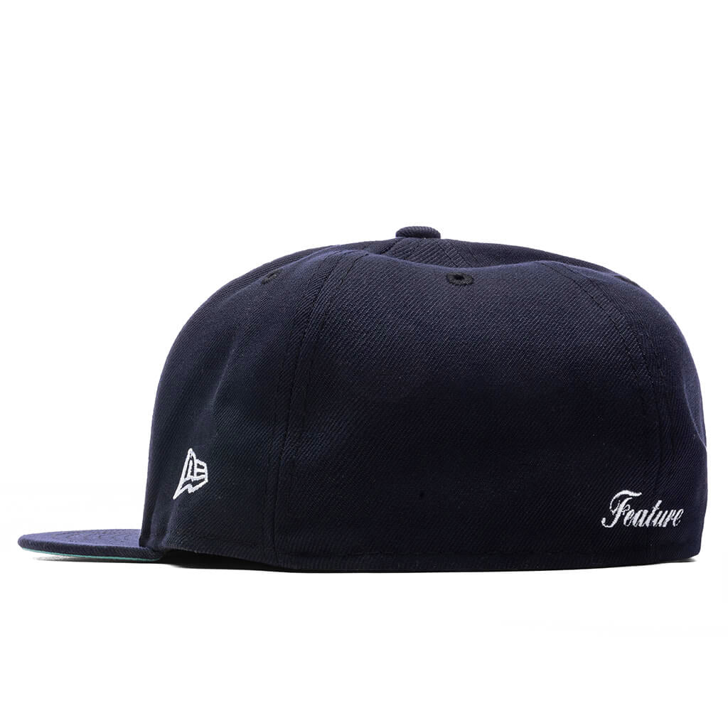 This Los Angeles Dodgers 59FIFTY fitted hat was released by Feature. The fitted has a navy blue six panel structured high crown and embroidered eyelets with a navy blue fabric squatchee button. The fitted cap also has a navy blue flat bill with a clearmint undervisor and black sweatband. The front panel features the Los Angeles Dodgers logo embroidery and flaming dice side patch embroidered in blue, white and clearmint tone on the right panel. The left panel of the fitted displays the New Era logo in white and the official Feature branded logo embroidery on the rear crown.