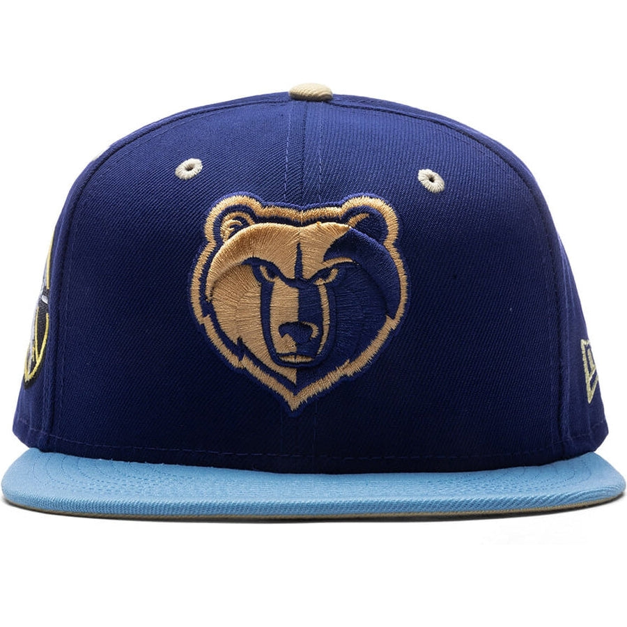 This New Era x Feature Memphis Grizzlies Navy/Sky/Tan 2023 59FIFTY Fitted Hat was released by Feature. The fitted has a navy blue six panel structured high crown, tan embroidered eyelets and a tan fabric squatchee button. The flat bill of the fitted cap is sky blue with a tan undervisor and black sweatband. The front panel features the Memphis Grizzlies logo embroidered in navy blue and tan stitching. The left panel of the fitted displays the New Era logo and celebratory side patch on the right panel. The official NBA & Feature logos are embroidered on the rear crown in tan stitching as well.