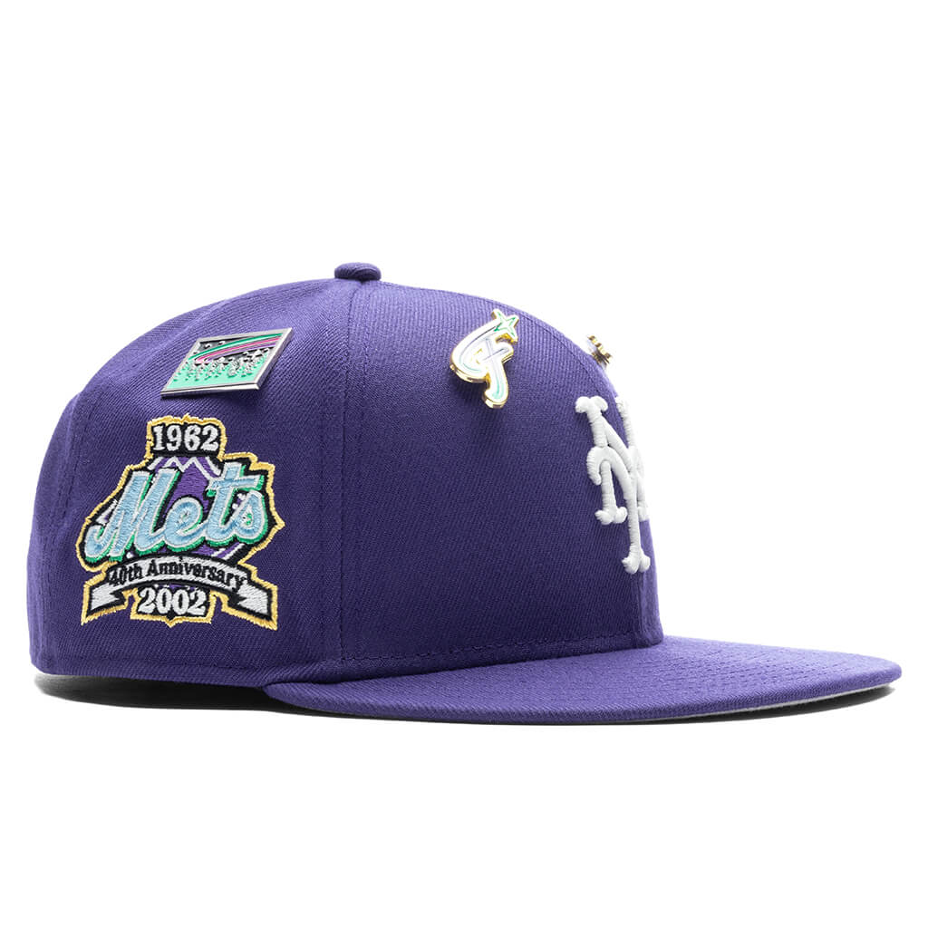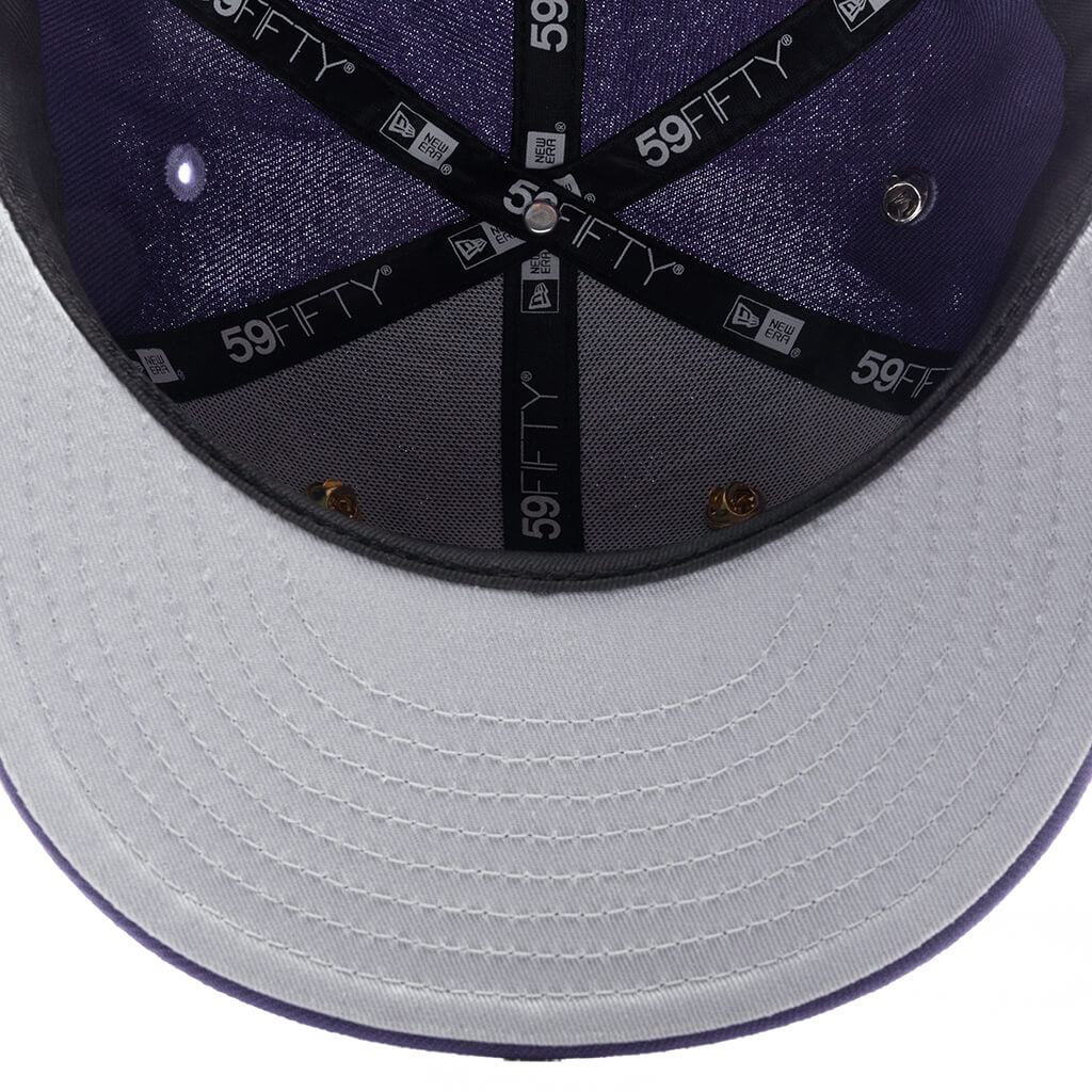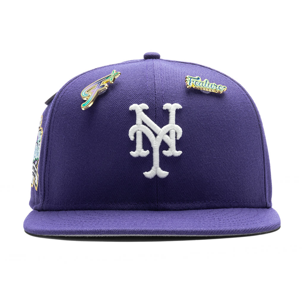 This New Era x Feature New York Mets Northern Lights 59FIFTY Fitted Hat was released by Feature. The Northern Lights fitted has a light navy blue six panel structured high crown, grey embroidered eyelets and light navy blue flat bill. The fitted cap has a grey bottom undervisor with a black sweatband . The front panel features the New York Mets logo embroidery and a side patch embroidered on the right panel. The left panel of the fitted displays the New Era logo and the official MLB logo embroidery on the rear crown.