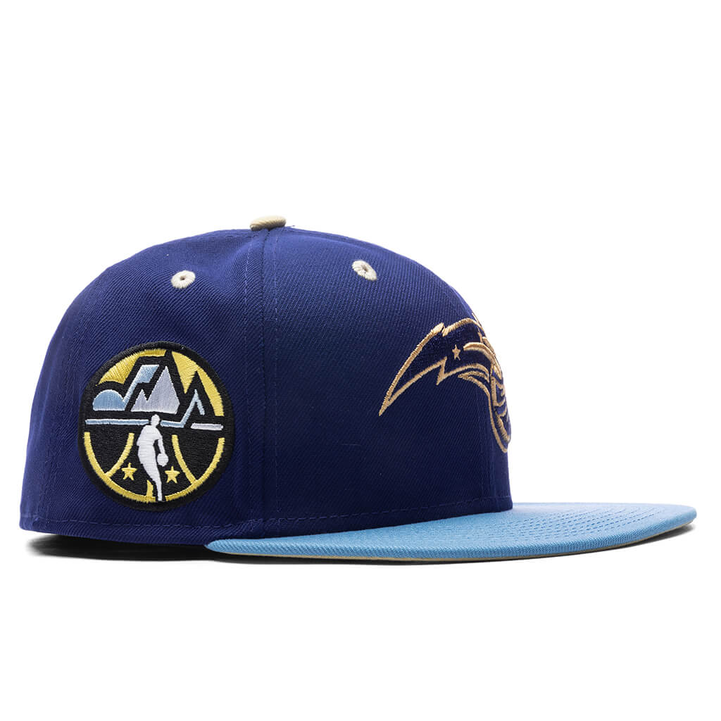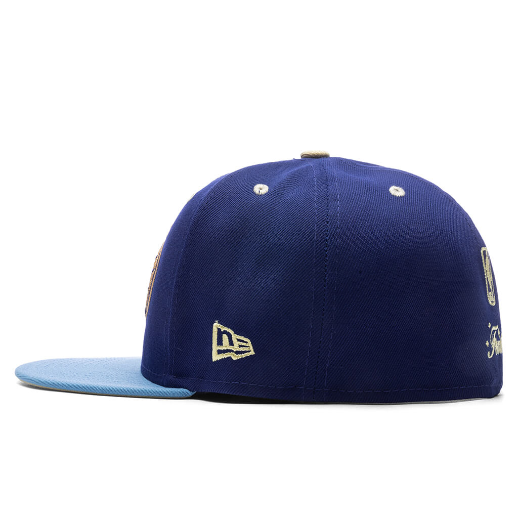 This New Era x Feature Orlando Magic Navy/Sky/Tan 2023 59FIFTY Fitted Hat was released by Feature. The fitted has a navy blue six panel structured high crown, tan embroidered eyelets and a tan fabric squatchee button. The flat bill of the fitted cap is sky blue with a tan undervisor and black sweatband. The front panel features the Orlando Magic logo embroidered in navy blue and tan stitching. The left panel of the fitted displays the New Era logo and celebratory side patch on the right panel. The official NBA & Feature logos are embroidered on the rear crown in tan stitching as well.