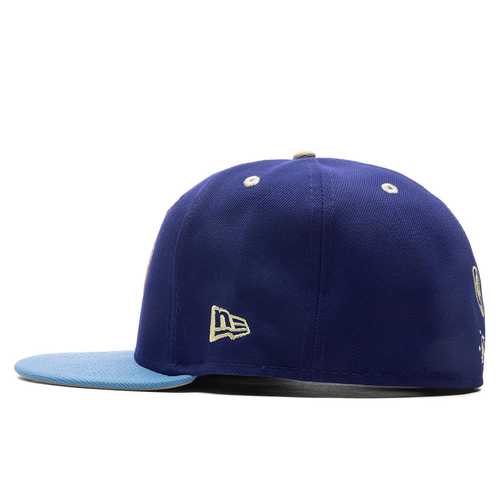 This New Era x Feature Portland Trailblazers Navy/Sky/Tan 2023 59FIFTY Fitted Hat was released by Feature. The fitted has a navy blue six panel structured high crown, tan embroidered eyelets and a tan fabric squatchee button. The flat bill of the fitted cap is sky blue with a tan undervisor and black sweatband. The front panel features the Portland Trail Blazers logo embroidered in navy blue and tan stitching. The left panel of the fitted displays the New Era logo and celebratory side patch on the right panel. The official NBA & Feature logos are embroidered on the rear crown in tan stitching as well.